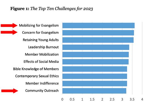 Last fall, the Great Commission Research Network surveyed evangelical church pastors and asked them about the top challenges they anticipated facing in 2023. Take a look at the table below, and you will notice the top two challenges, along with number ten, all relate to evangelism.