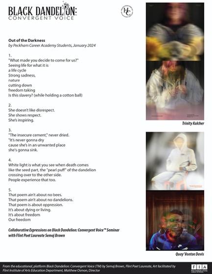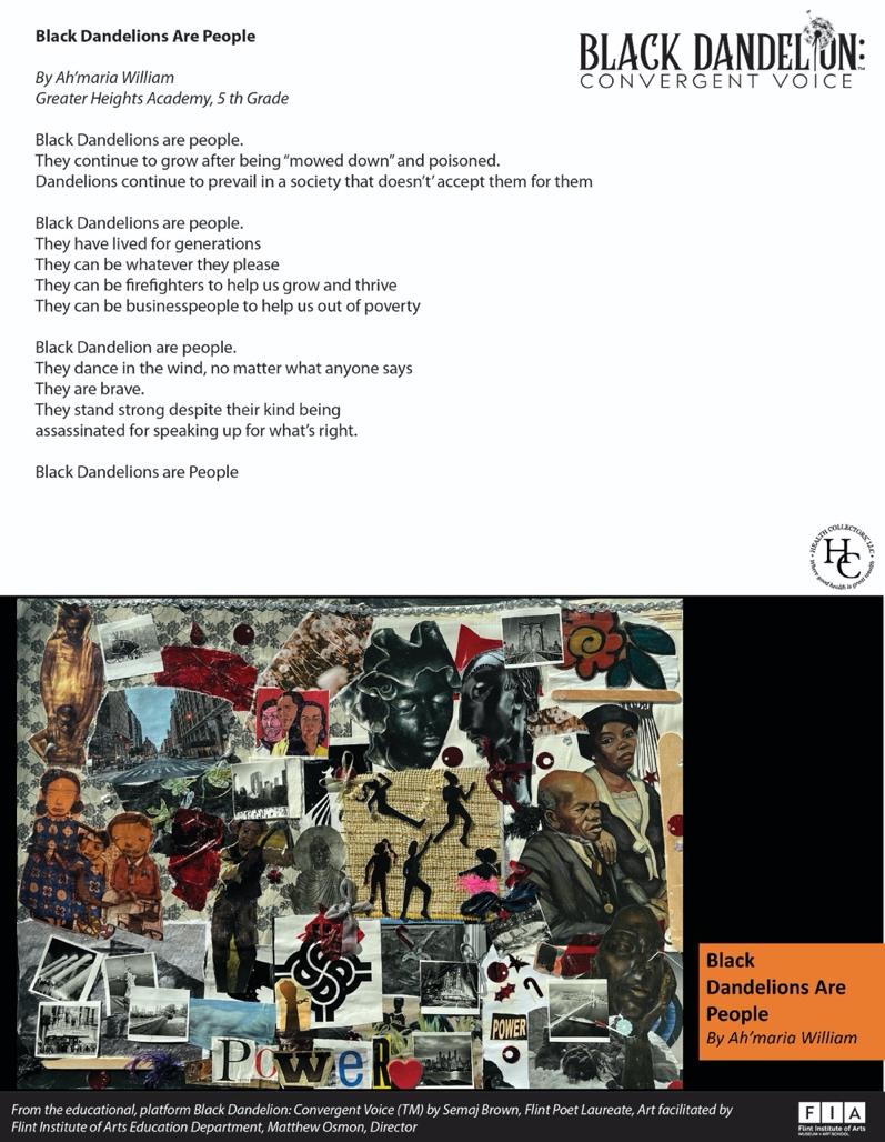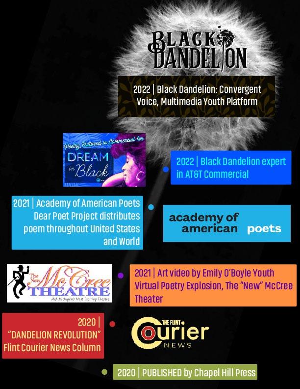 BLACK DANDELION: CONVERGENT VOICE™ (BDCV) is a multimedia educational platform derived from Semaj Brown's internationally celebrated poem, “Black Dandelion,” and from the learning arts innovation, PSL / POETRY AS A SECOND LANGUAGE: THE SEMAJIAN METHOD.™ The method is intergenerational and futuristic, utilizing applied poetry as an integrative technology to expand and amplify literacy capacity, critical thinking, and Social Emotional Learning (SEL) across varying disciplines: ecology & science, art, history, women's and girls' empowerment, nutrition, social justice studies, and more. BDCV has been engaged from Flint to West Togo Africa, from elementary school to graduate studies. AT&T licensed a powerful excerpt of the poem for a national television commercial, Dream in Black African American Afrofuturistic Lifestyles Platform in celebration of generational Black Excellence. Black Enterprise.com, in an April 2023 article, states, Black Dandelion: Convergent Voice™ Changes the Literacy Game. Elisse Ramey, WNEM Channel 5, CBS affiliate reporter/anchor in a recent feature, broadcasted, "Flint Inaugural Poet Laureate receives International Acclaim."