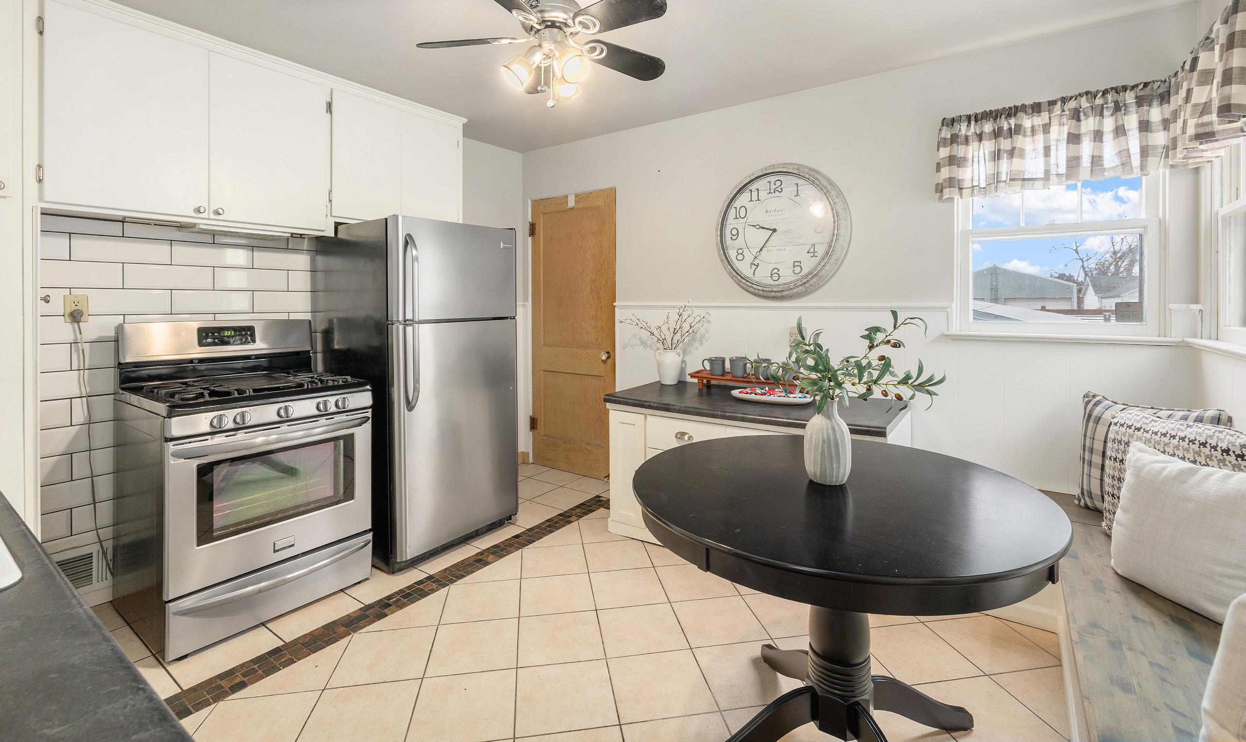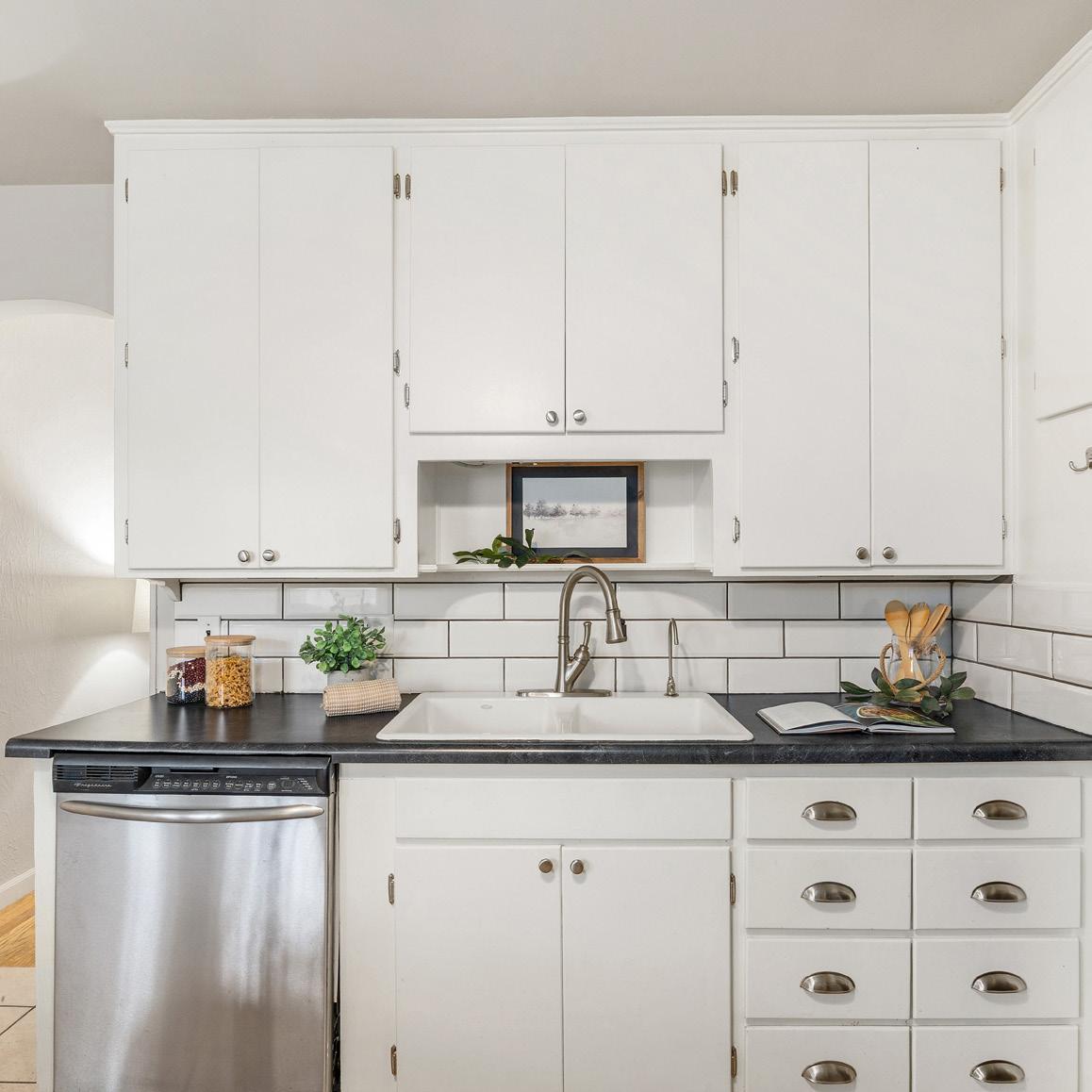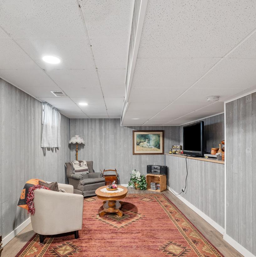 Charming ranch-style home blends comfort and functionality, ideal for a small family, couple, or those looking to downsize. A bright living room with gleaming hardwood floors flows into a compact yet efficient kitchen with gas range, ample cabinet space, new countertops, and a stylish subway tile backsplash, plus a cozy eatin area opening to a covered patio for outdoor dining or gardening. Two privately situated bedrooms share a central full bath, complemented by a spacious basement family room and an attached one-car garage with carport, extra parking, and a sprinkler system to keep the mature flowers and raspberry bushes thriving.