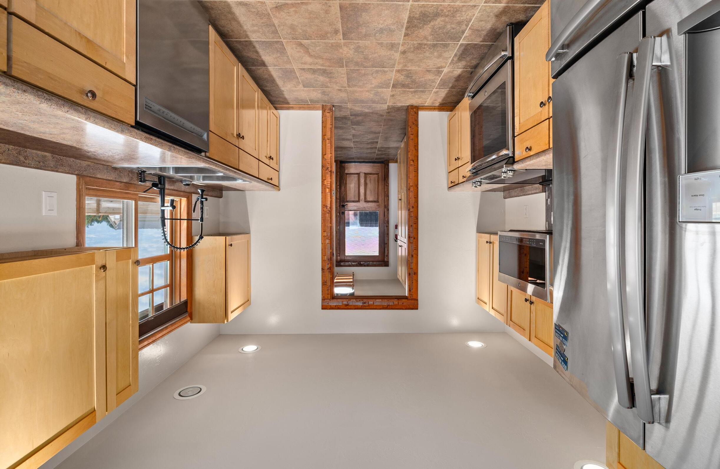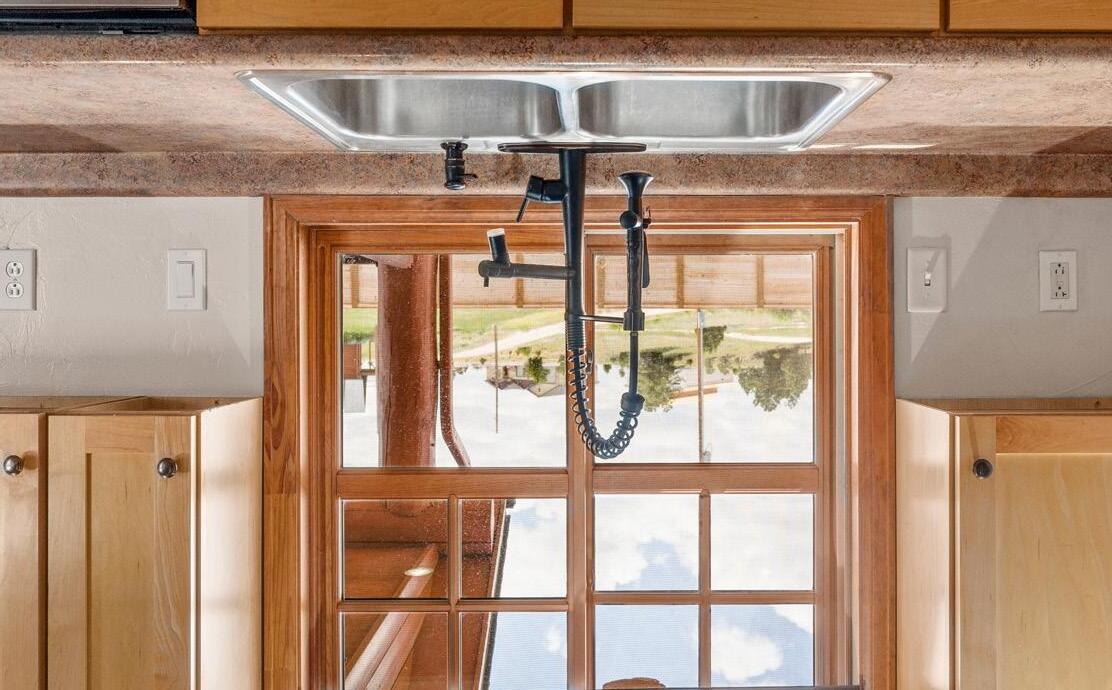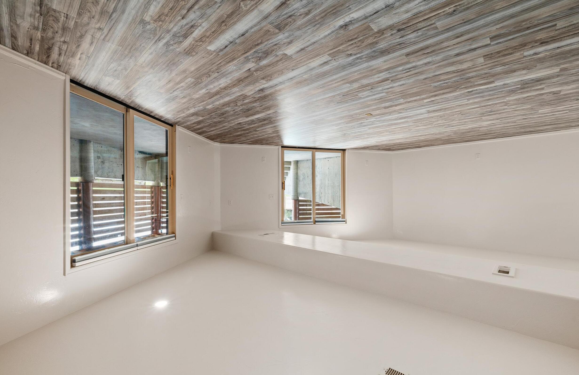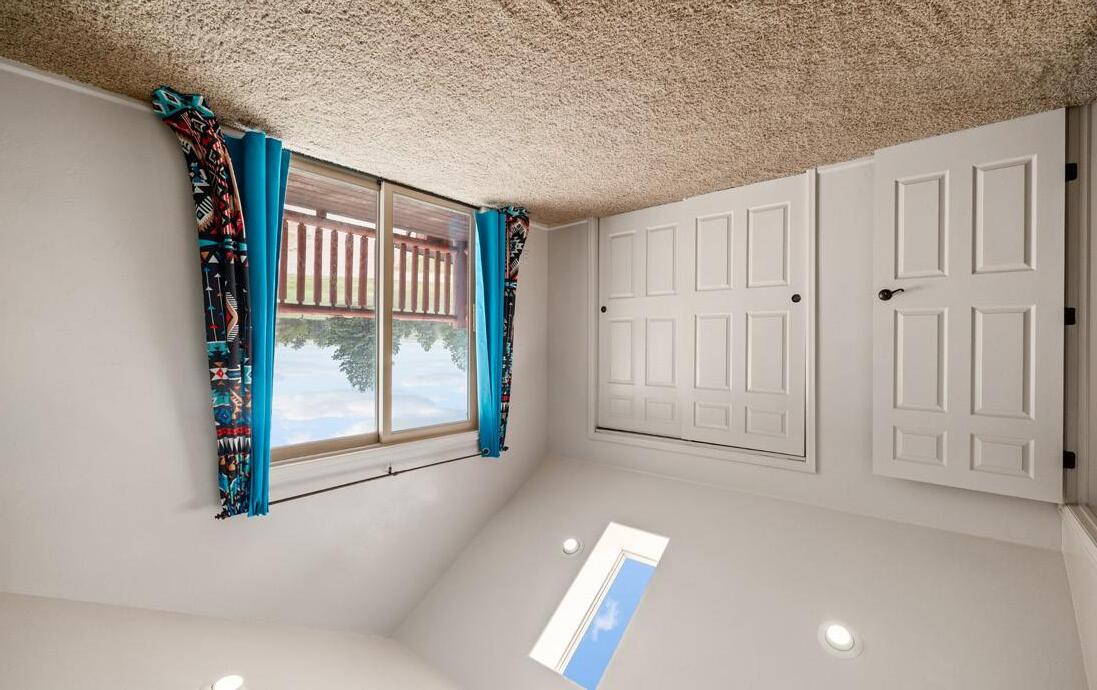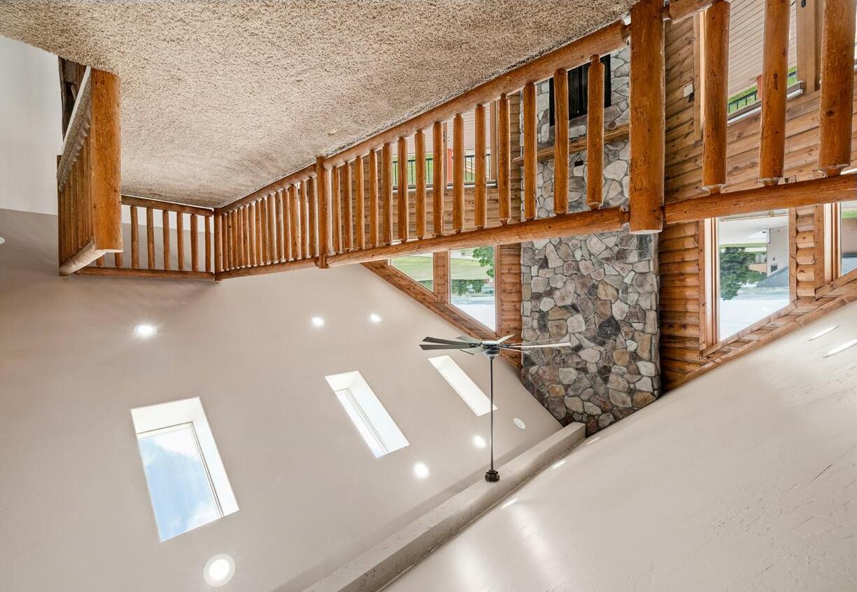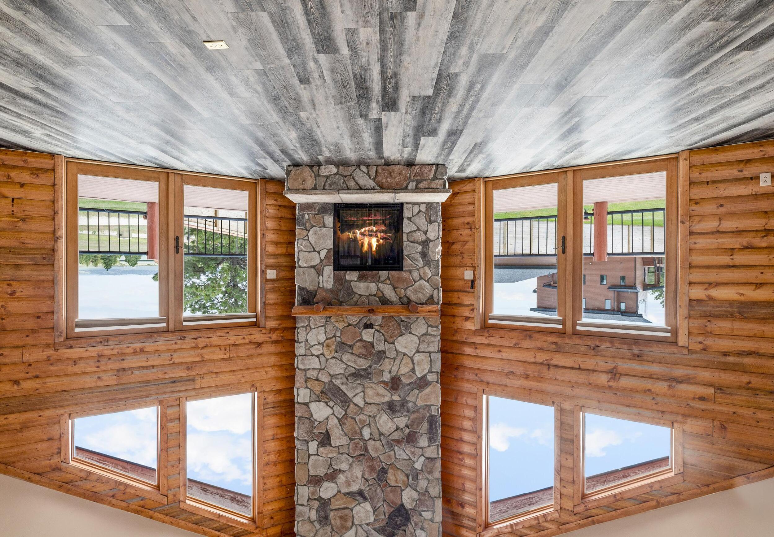 The open living area boasts a rock fireplace, vaulted ceilings, and expansive windows that flood the space with natural light.