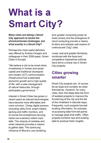What is a Smart City? Many cities are taking a Smart City approach to tackle the aforementioned challenges, but what exactly is a Smart City? Perhaps the most useful definition was offered by Andrea Caragliu and colleagues in their 2009 paper, Smart Cities in Europe: “We believe a city to be smart when investments in human and social capital and traditional (transport) and modern (ICT) communication infrastructure fuel sustainable economic growth and a high quality of life, with a wise management of natural resources, through participatory governance.” 11 Interest in Smart Cities has grown in recent years as relevant technologies have become more affordable and more common. Cheap digital sensors (including utility firms’ smart-meters, parking and traffic monitors, and of course the smartphone-carrying citizen-as-a-sensor) collect input data. The ubiquity of wireless and wired networks provides a means to gather data. The continuing influence of Moore’s Law (enabling 10
