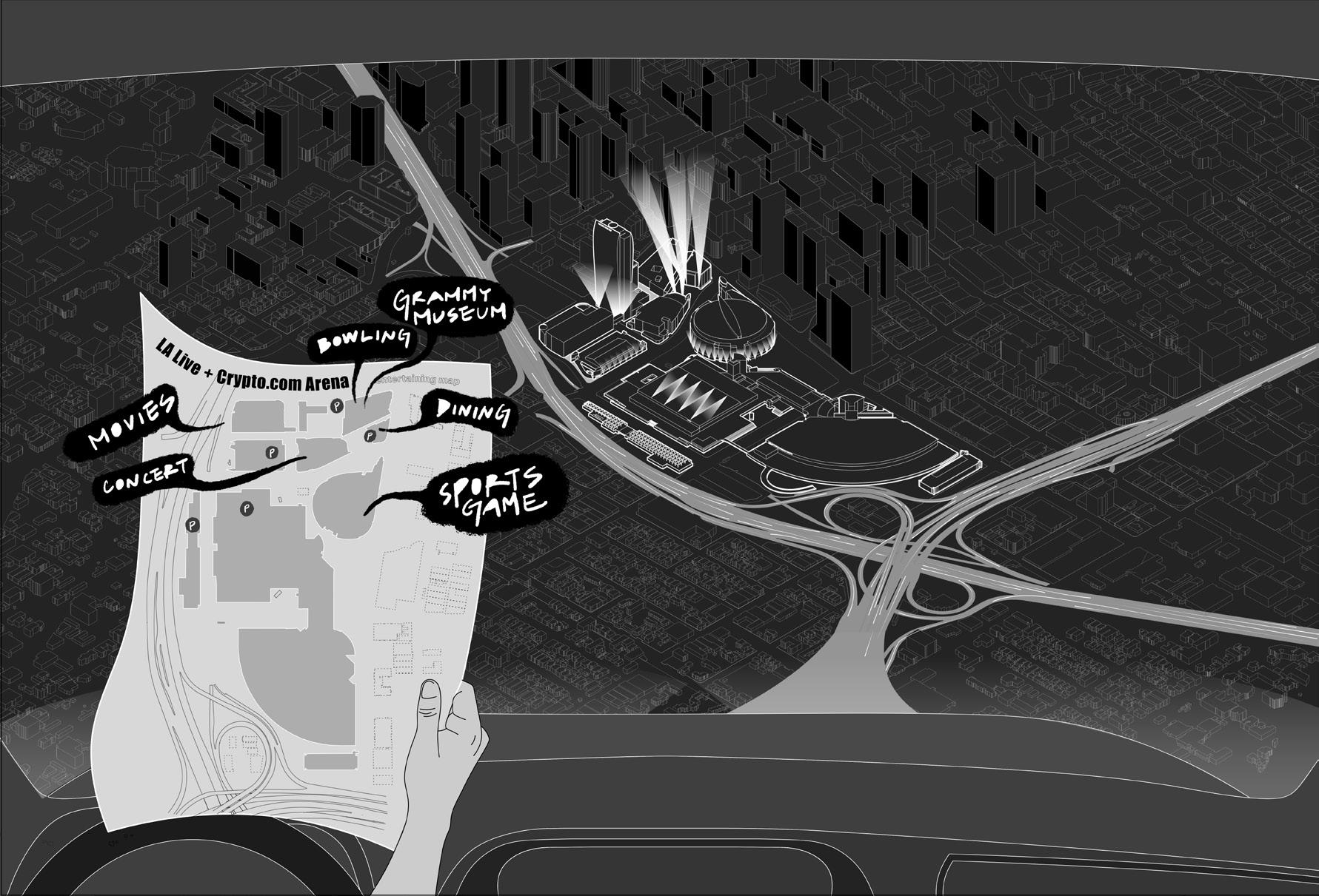 The drawings used a surreal composition, emphasize on how L.A Live serves the cars, instead of people, and segregated by highways. Day and night comparations indicates two sides of L.A Live, documented the voices of people.