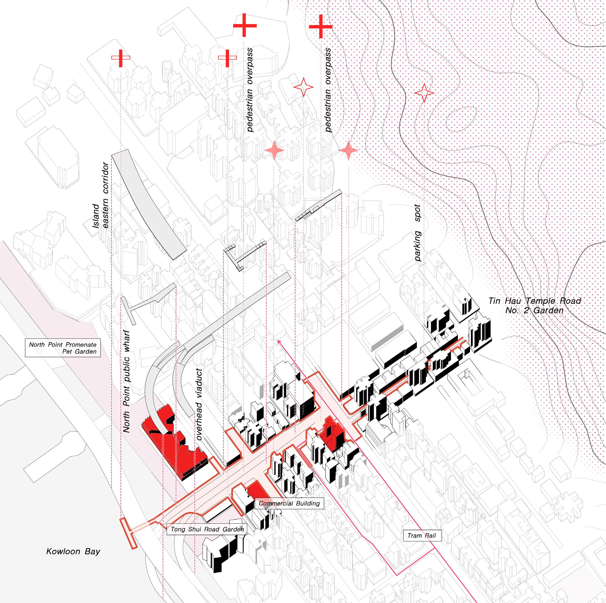 Adapting to the form of scaffolding, the design make ecological and social contribution for the city of Hong Kong. The scaffolding bridges a corridor between the mountain and the ocean, meanwhile providing resting and shading space for outdoor workers and people on the street.