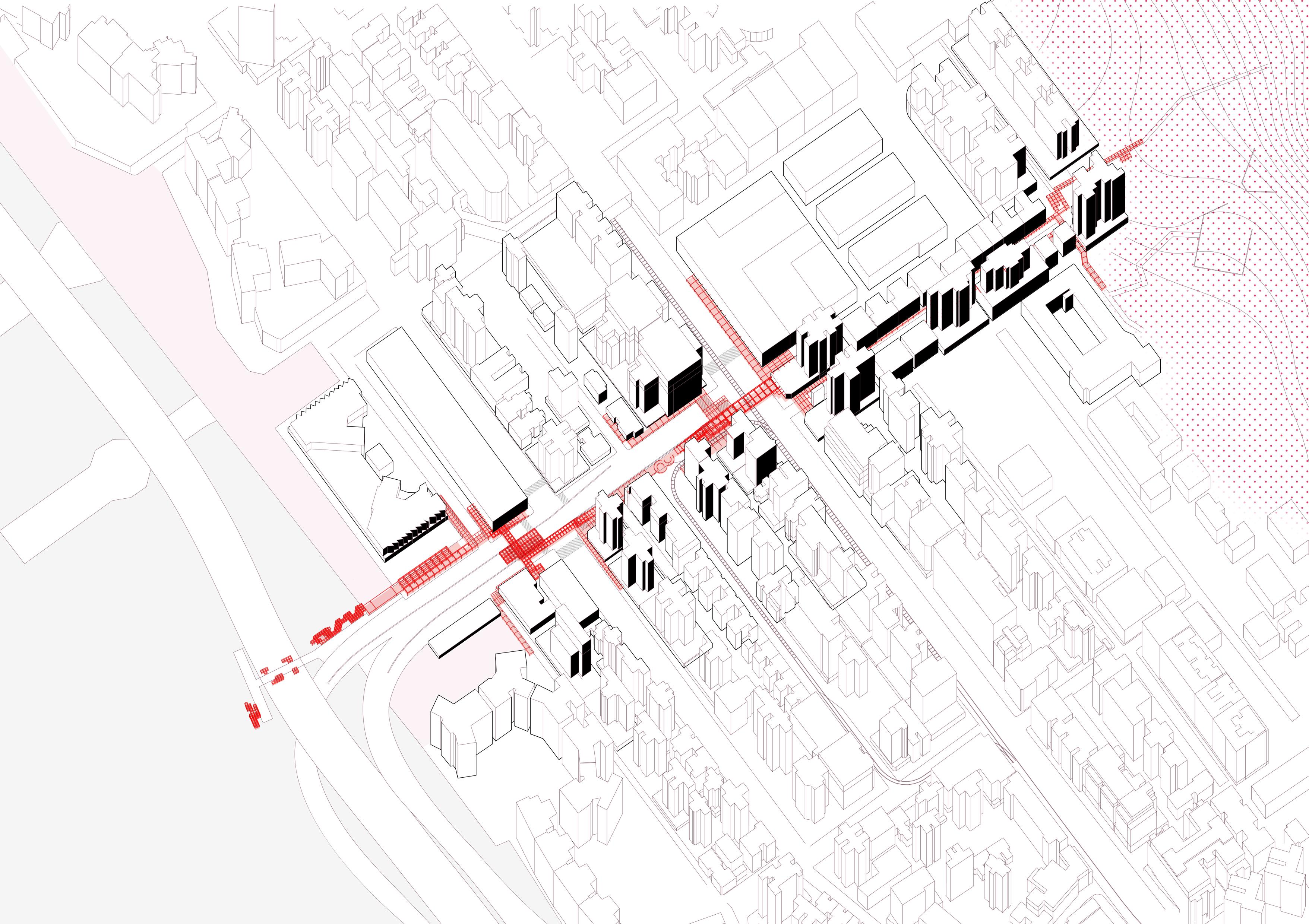 Ground Plan for New Fashion District: opening up ground floor, connecting circulation to inner Chinatown