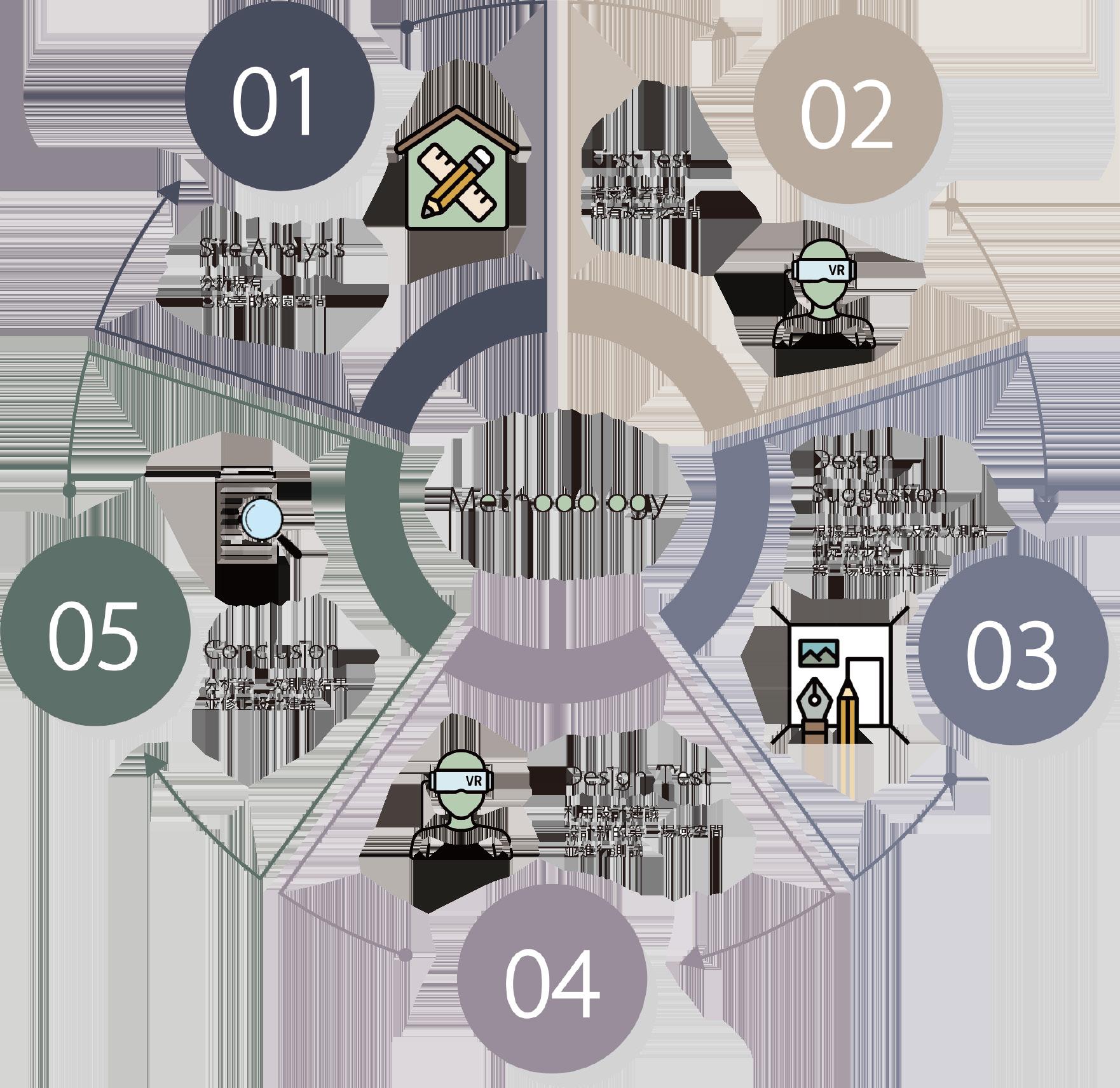 以逢甲大學近五年有改善的第三場域 空間作為現有基地,分析後進行第一階段 測試。測驗內容為讓受測者配戴 VR 眼鏡 及腦波儀,觀看受測基地,同時收集眼動 及腦波數據。並在觀測後填寫情緒體驗問 卷。