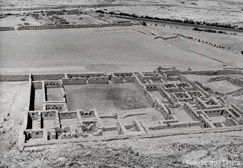 EDIFICACIONES: esta divido por tres sectores que seria el norte centro y el sur estos separados por un camino que baja de la sierra hacia la costa y esto en una gran plaza trapezoidal teniendo un pirámide que se divisa una claridad del valle camino al mar