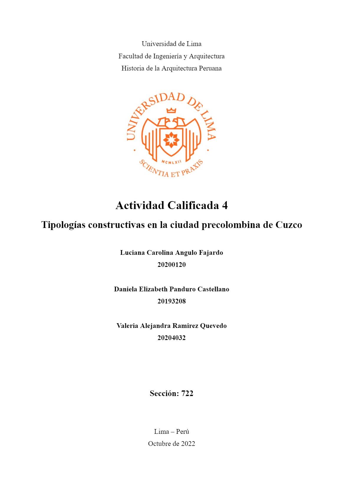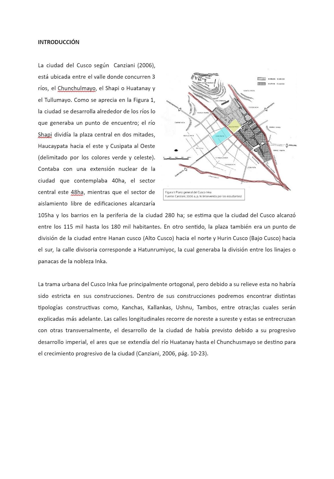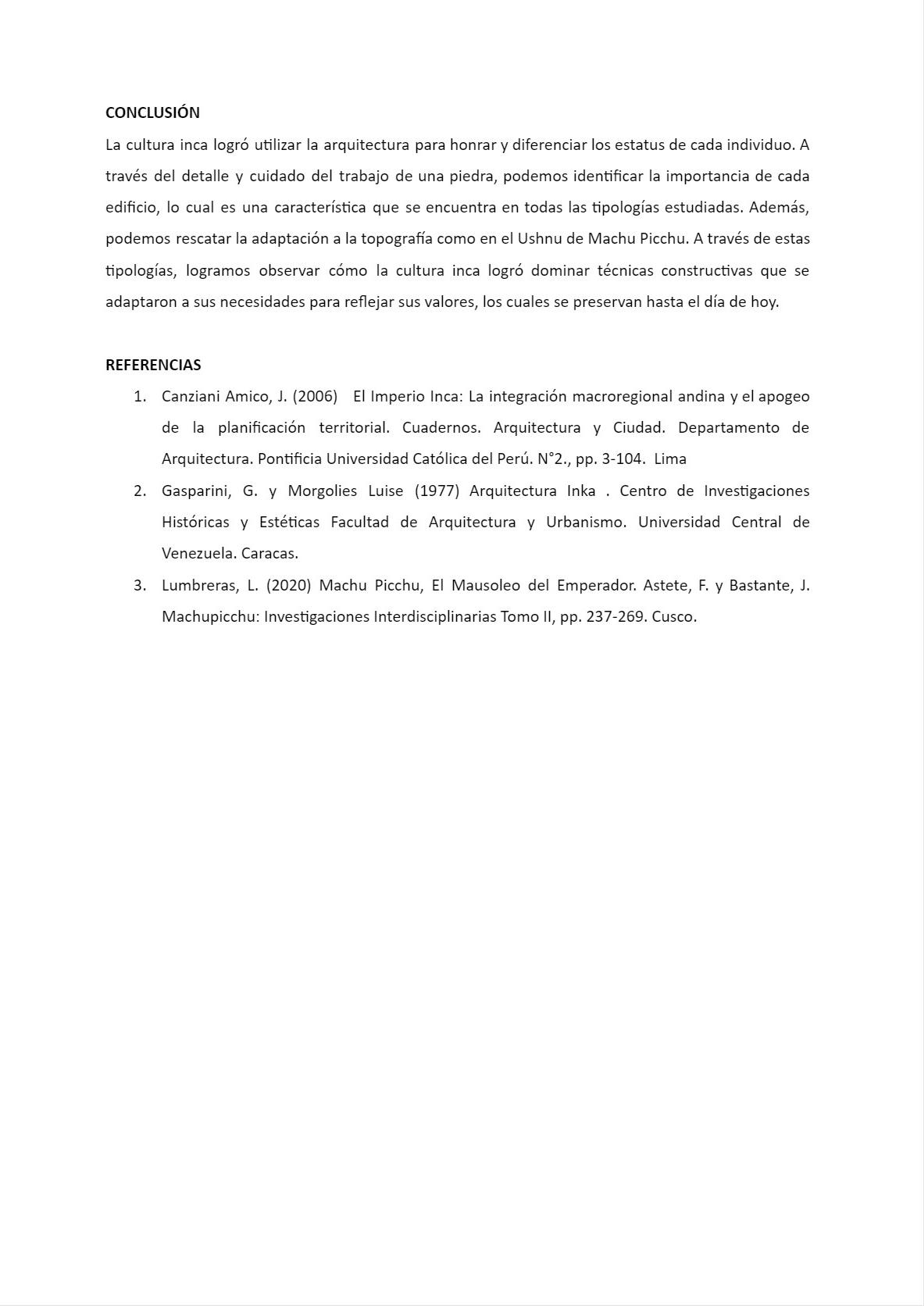 El cuarto trabajo conste en el análisis de diferentes tipologías constructivas de la ciudad precolombina de Cuzco. Se encontraron diferentes patrones en la tipología inca y se citaron las fuentes en APA, usando los referentes proporcionados por la profesora.