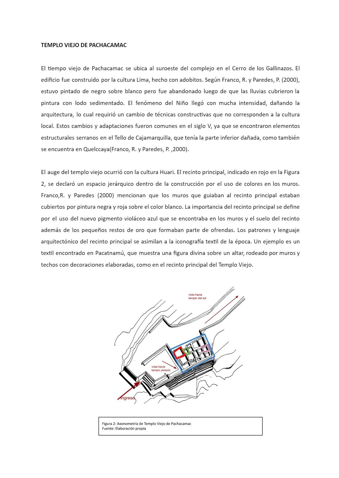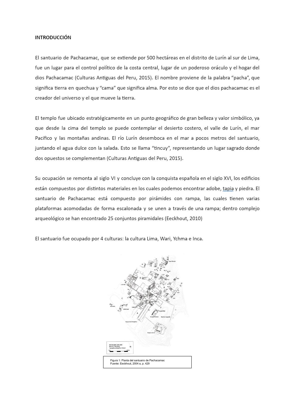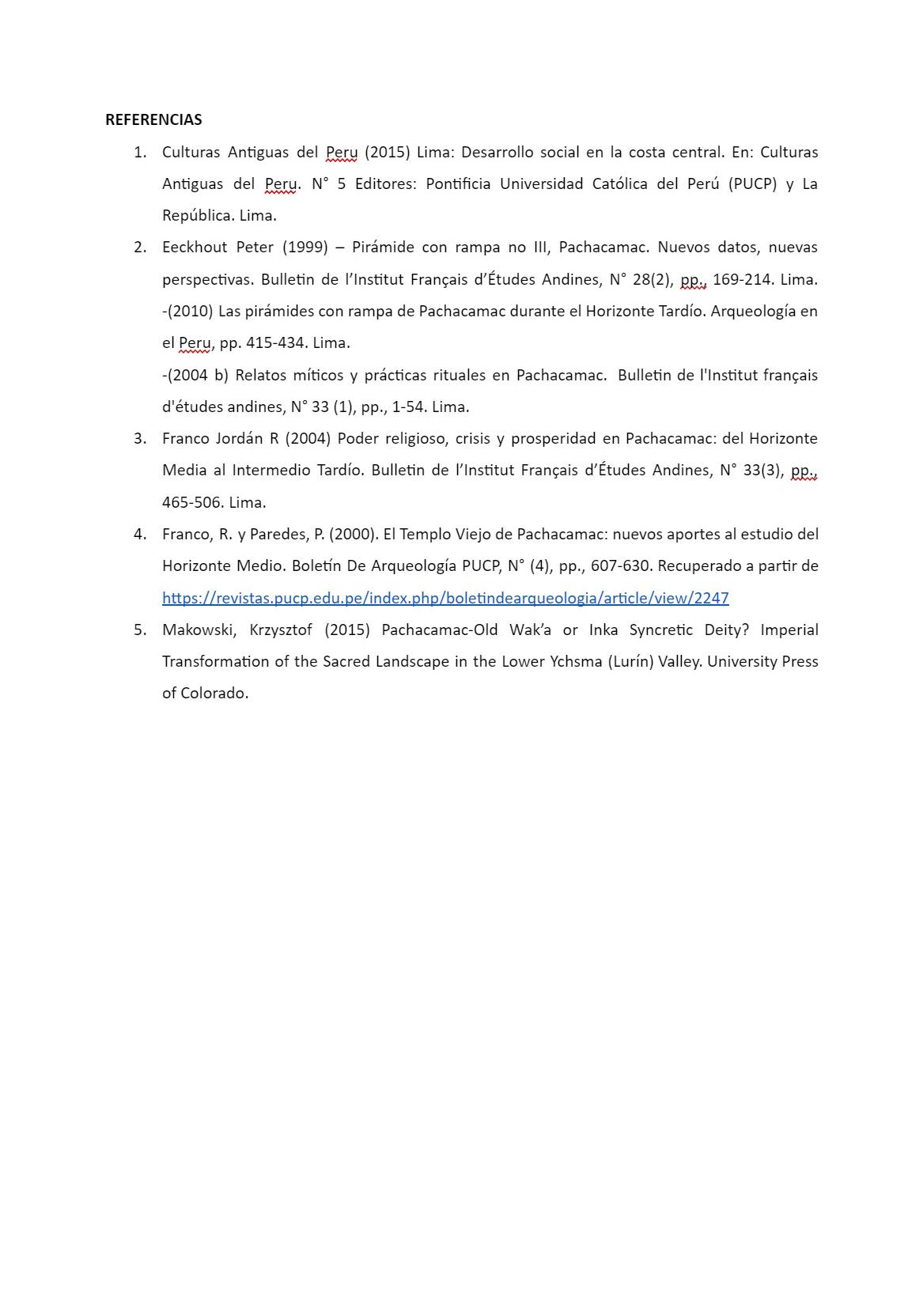 El tercer trabajo trata del Santuario de Pachacamac. Después de una visita con el salón, se ralizó un análisis de sitio arqueológico. El análisis da una introducción sobre la precedencia del lugar y anali za con profundidad el Templo Mayor y las pirámides con rampa, citando con APA los referentes utilizados para la investigación.