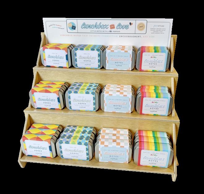 Branded display filled with 36 lunchbox note tins (9 each of 4 styles). Cost of display is offset with $56 in free product (4 free tins)!