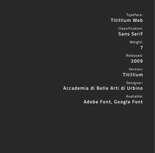 Titillium Web is an open-source font, freely avaliable for personal and compercial purpose. The typeface was a collaborative effort within the Accademia di Belle Arti di Urbino, Italy including students and staffs.