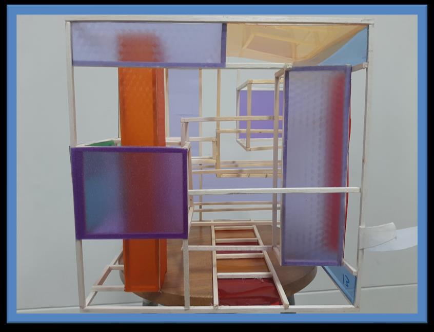 En esta sesión se enseño como los espacios interiores se relacionan entre si para así poder formar una composición con estos, estos se relación de 4 distintas formas esenciales o más, ya aprendido esto se elaboro con palitos balsa y micas de colores una composición con forma de cubo que contenga la relación de espacios enseñada. La siguiente imagen es un avance de la composición que hice.