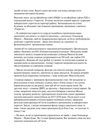 засоби зв’язку тощо. Всього цього вистачає для понад півтори сотні мешканців житлового будинку. Важливо знати, що на офіційному сайті КМДА та на офіційних сайтах РДА є спеціальний розділ «Укриття». В ньому міститься повний перелік з адресами найпростіших укриттів на території району. Безпосередньо на стінах будинків, де обладнані такі підвальні приміщення, вказівники з написом: «Укриття». – Ці найпростіші укриття та споруди подвійного призначення якраз призначені для захисту та укриття населення, – наголошує Олександр Макеєв. – Важливо, щоб не захаращувалися проходи, не було трубопроводів, особливо з гарячою водою... Дещо інші вимоги до «начинки» та функціонального призначення сховищ. Інший об’єкт цивільногозахисту населення розташований у Деснянському районі. Належить він КП «Київжитлоспецексплуатація». Начальник штабу цивільного захисту підприємства комендант сховища Микола Будник розповів, що площа сховища, розрахованого на 300 осіб, має майже 250 «квадратів». Власник об’єкта зробив тут ремонт та підготував сховище до використання за призначенням. Атепер і щорічно витрачаються кошти на обслуговування та утримання сховища. – Маємо потужний генератор, фільтри для очистки повітря, центральне водопостачання, санвузол, протигази та запас продуктів. За першої потреби провізія буде оперативно поповнена, – каже комендант Микола Будник. Сховища справді у зразковому функціональному стані. Не випадково за результатами огляду-конкурсу сховищ, яких у Києві понад п’ять сотень (проводиться раз на два роки), саме цей об’єкт посів перше місце. На другому місці – сховище ДВРЗ, на третьому – Бортницької станції аерації. До слова, наприкінці минулого року депутати Київради ухвалили Міську цільову програму розвитку територіальної підсистеми єдиної державної системи цивільного захистуКиєва на 2017–2019 роки. Після цього в усіх райдержадміністраціях столицістворено відповідні комісії, проведена ретельна інвентаризація об’єктів подвійного призначення та найпростіших укриттів. Звісно, з метою поповнення фонду споруд цивільного захис ту киян. І якщо два роки тому таких приміщень було біля 4 тис., то сьогодні їх понад 5 тис. – На жаль, не всі ці приміщення утримуються, як треба, – каже Олександр Макеєв. – Всяко буває. Як і в плані фінансування. Все залежить лише від волі нинішніх власників цих об’єктів.