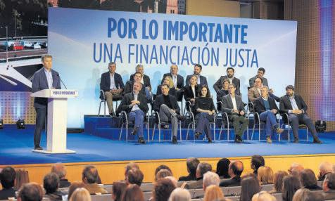Feijóo se comprometió a presentar un modelo de financiación «transparente y pensado para todos los españoles» en el plazo de un mes. Para consensuarlo prometió convocar a los dirigentes autonómicos en una Conferencia de Presidentes «monográfica» en su primer mes de mandato y reanudar los grupos de trabajo técnico para «repartir los 200.000 millones de euros». Feijóo señaló que la Conferencia se iniciaría con una «evaluación independiente» de la infrafinanciación de las comunidades, que «no independentista», para que sea «justa». «Para nosotros la igualdad entre españoles no está en venta. El PP no puede llegar a la Presidencia del Gobierno rompiendo la igualdad ante los ciudadanos», proclamó rodeado de sus barones. «En España caben los matices y caben las diferencias. Nos enriquecen. Pero lo que no caben son las fronteras internas, no caben los chantajes y no caben los privilegios. Y por eso estamos hoy [por ayer] aquí: para decirlo, para defenderlo y para dar la cara», concluyó el líder popular. l