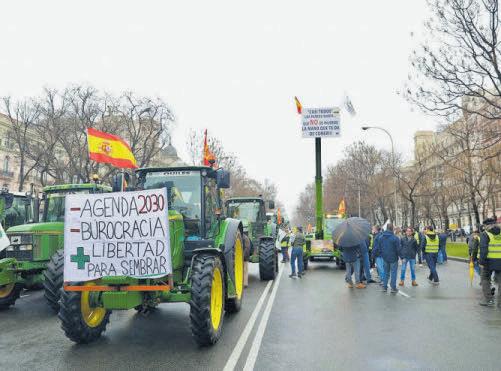 Nacional de Asociaciones del Sector Primario Independientes (Unaspi). Los cientos de tractores y la marea de hombres y mujeres del campo confluyeron en la Plaza de Colón para, desde allí, dirigirse por el Paseo del Prado a la sede del Ministerio de Agricultura, frente a la estación de Atocha. El corte de calles obligó a muchos viajeros a dar un improvisado paseo maletas en ristre. Además de ofrecer una escena insólita para más de un despistado turista. «¡No a Mercosur!», «¡El campo no se vende!», coreaban los agricultores y ganaderos a lo largo del recorrido, entre sonoras pitadas al aproximarse al Congreso de los Diputados o al Ministerio de Derechos Sociales. Alrededor de todos ellos, un despliegue de Policía Nacional, Guardia Civil y Policía Municipal de Madrid que, según datos ofreci-