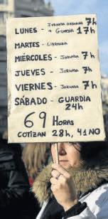 Sindicato Médico Andaluz (SMA)– los MIR como Blanca Lucio, residente de Neurología del Gregorio Marañón. Explica que le «puede llegar un ictus a las seis de la mañana sin haber dormido absolutamente nada desde las siete de la mañana del día anterior, cuando eso es una urgencia vital» También se sumó a la protesta Elisa Fernández, que renunció a su empleo en Urgencias del Hospital de Guadalajara para conciliar: «Tengo una niña pequeña y estaba con una reducción, pero haciendo el 100% de guardias; como estas no cotizan nada, he estado un año entero que me cuenta como seis meses». «Las guardias son penosas» «No tiene ningún sentido que en Atención Primaria se estén atendiendo 40-50 pacientes forzados, o que haya médicos haciendo 60-70 horas a la semana», denunció la secretaria general de Amyts. La dirigente sindical afeó la «falta de voluntad negociadora» del ministerio y acusó a los políticos de mentir en el tema de las guardias « Siguen siendo obligatorias y son muy penosas». Además de en la capital, la marcha también se celebró en otras ciudades como Barcelona, donde se concentraron unos 800 médicos, según la Guardia Urbana. A nivel nacional, CESM cifró entre el 85 y el 90% el seguimiento de los paros «pese a los servicios mínimos abusivos». Aunque estos dependen de cada autonomía, por lo general se garantizó la actividad urgente y los efectivos fueron los equivalentes a un festivo. Según el servicio autonómico de salud, el seguimiento en Cataluña fue de un 6,5% –frente al 45% que cita Metges de Catalunya–; en Andalucía, un 32%–frente al seguimiento «alto» según el SMA–; en la Comunidad Valenciana, el CESM habló de un seguimiento del 80% en Atención Hospitalaria y un 75% en Prima-