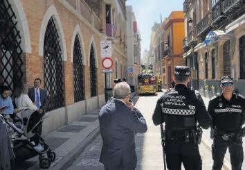 Agentes de la Policía Local cortan la calle Cuna tras un incendio en un bar. JOAQUÍN CORCHERO/EP