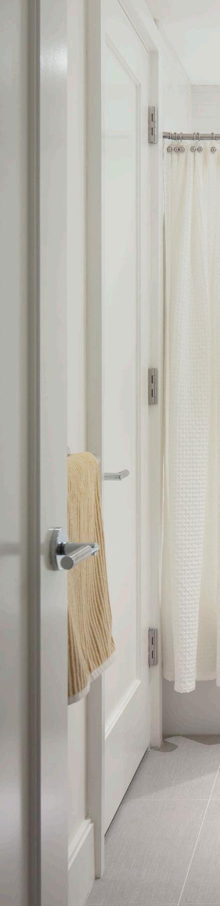 Bathrooms with a cool, toneon-tone color palette have been designed with a fresh, timeless style. Floor-toceiling tile-clad walls gently reflect ambient light. Polished nickel accents appear in the custom vanity, the mirror frame, and sconces with glass shades. Deep vanity drawers offer ample storage to keep toiletries within reach yet out of sight.