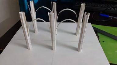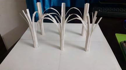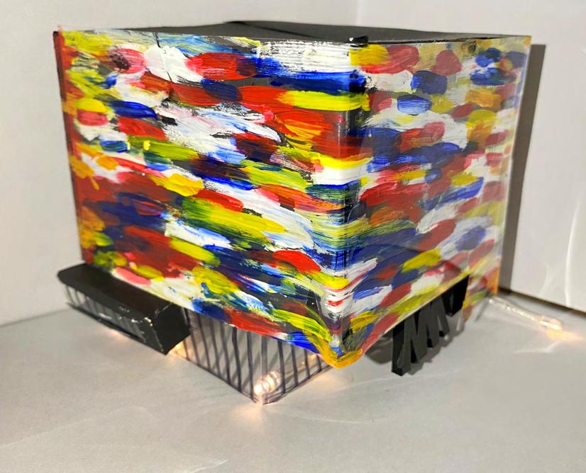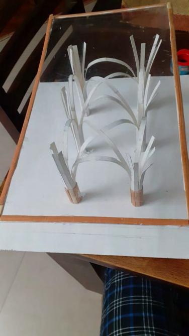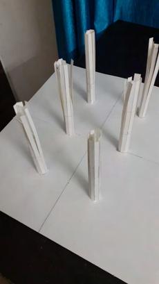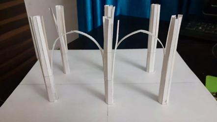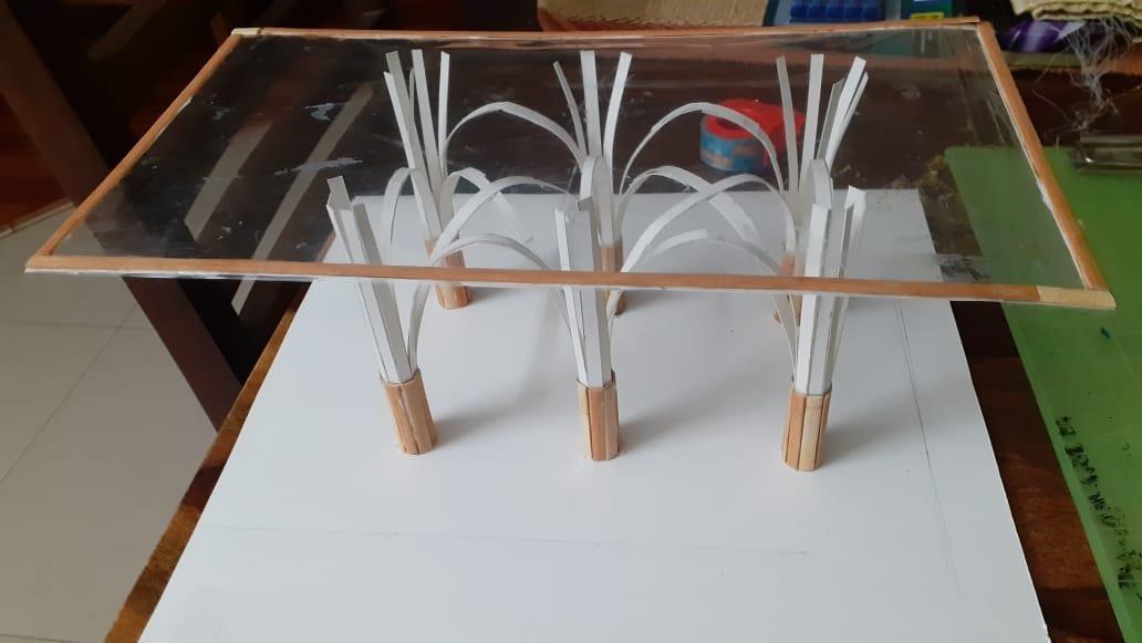 ANA SANCHEZThe model was started by using strips of paper to represent the key columns of the building. The strips were then separated at the top and connected to form the structure of the latticed roof. The columns were then stabilized with wood strips and a layer of paper, then clear plastic, was used to show the intricate pattern of the columns.