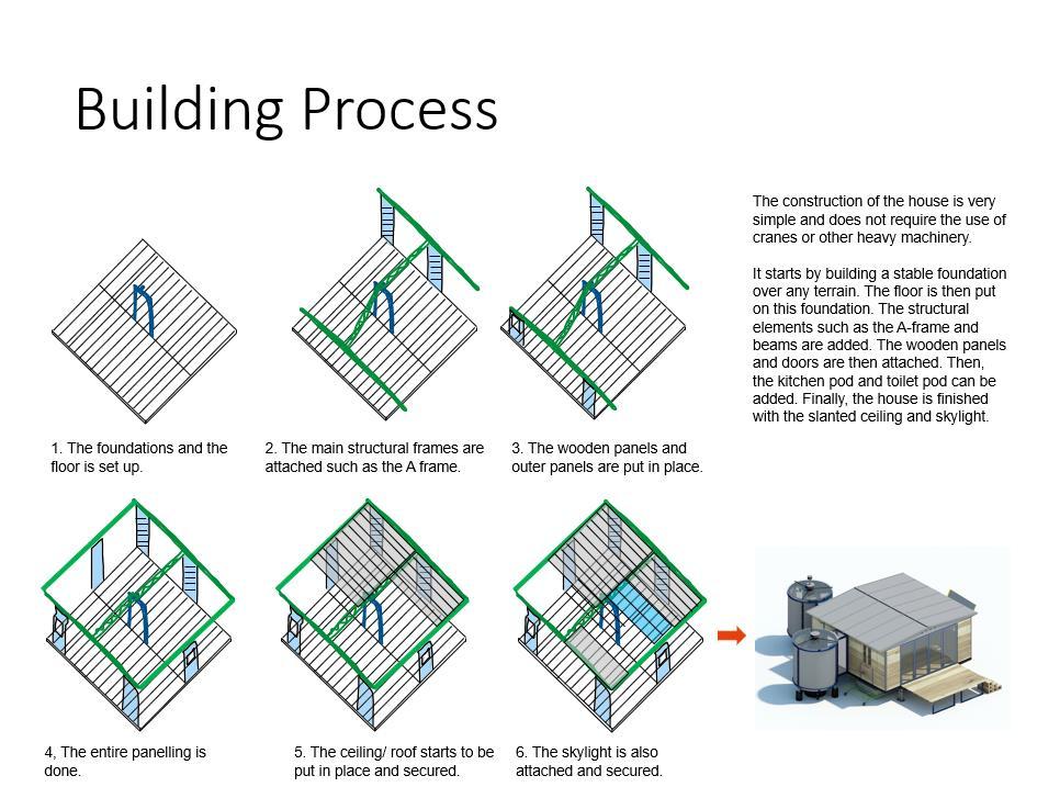The process starts by making the foundation and floor. This will be the base for all the construction. Wooden pieces are cut in a way to interlock and are then attached to form the frames. These frames are put together and further made stronger by adding beams and columns. Finally, the exterior is completed by attaching the wooden panels as walls, doors, and windows.