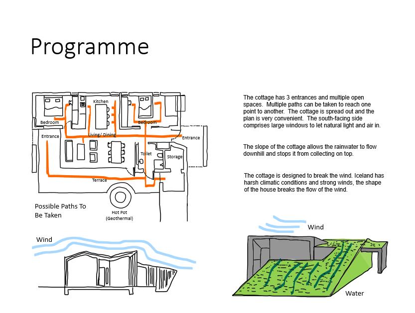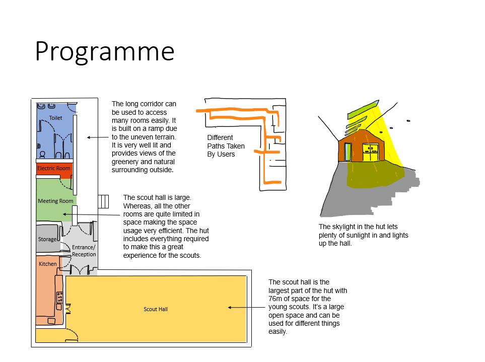 The building has clearly been designed according to the climate of Manchester. Manchester is a rainy city and hence, the sloped roof prevents water from collecting on the roof. The skylight has also been placed to let the occasional but healthy and beautiful natural light into the hut.