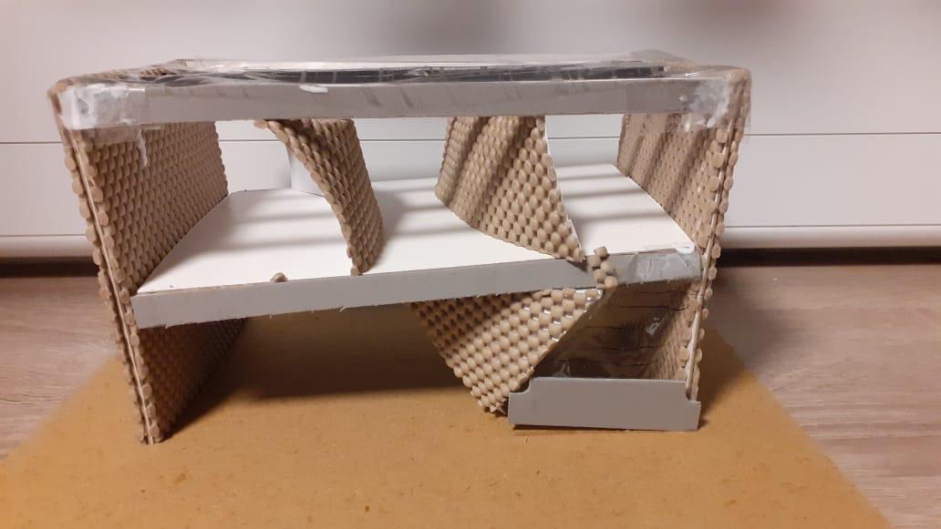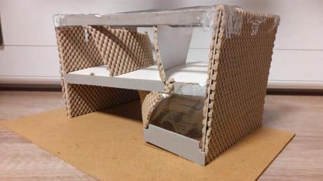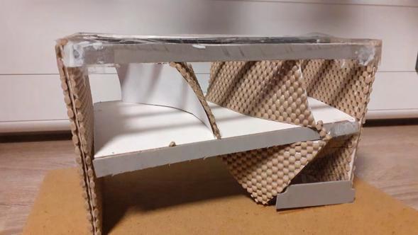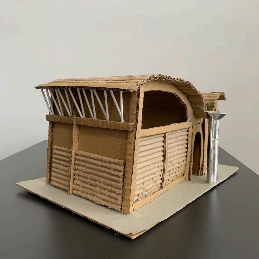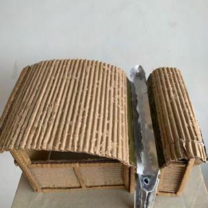 When I initially researched the structure of the Magney house, and its sustainability through the genius design of the roof, I wanted to explore this feature through my model. I used corrugated cardboard to represent the corrugated stainless steel and used card to show the buildings main irrigation system. This was the main feature I wanted to emphasize. The roof collects the Australian rainwater so it can be reused for drinking and heating, I wanted to show this through the shape of the roof and its texture, as shown in the aerial view photos. Steel tubing is also used as an internal frame which adds a lightness to the building and acts as a very light skeleton.