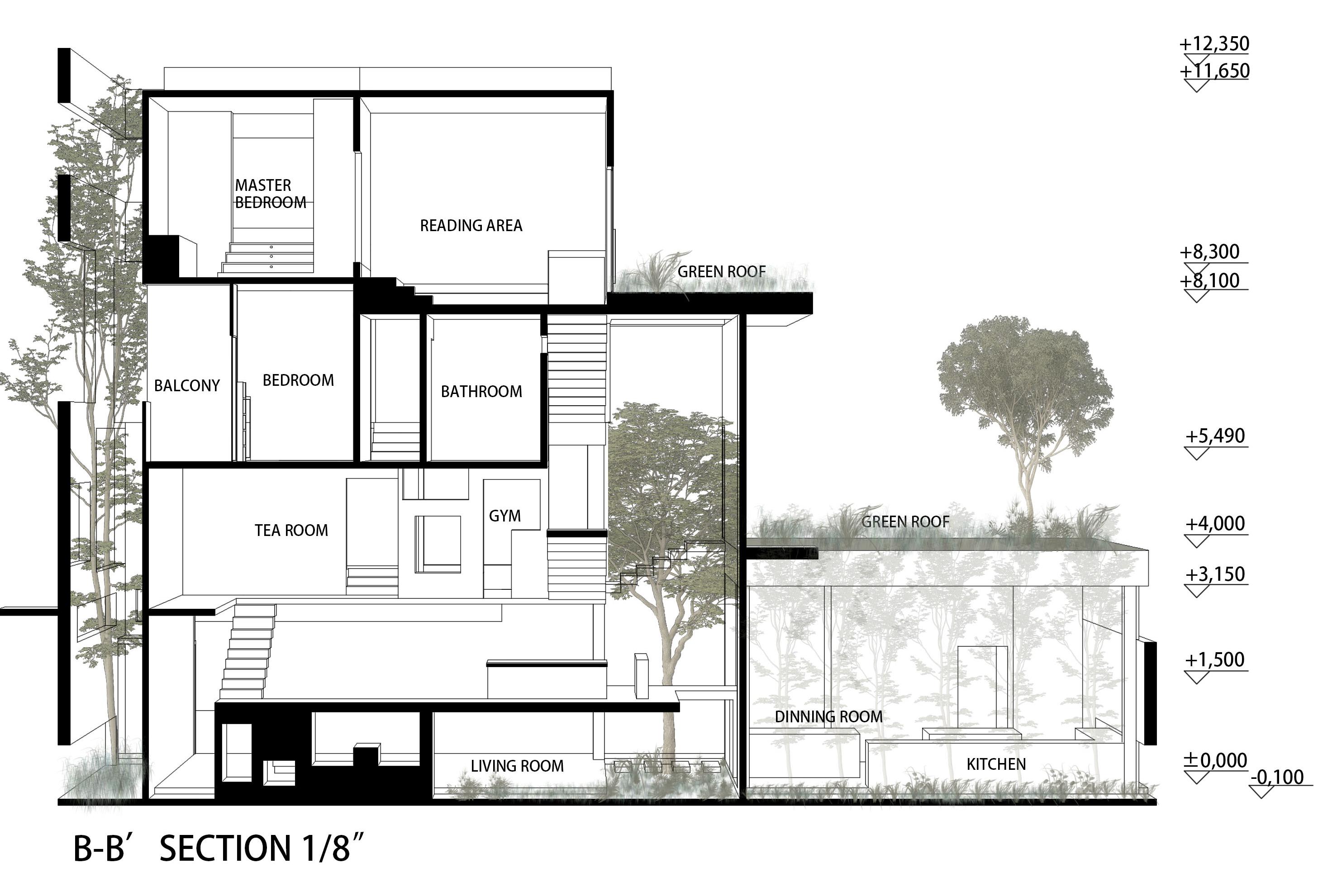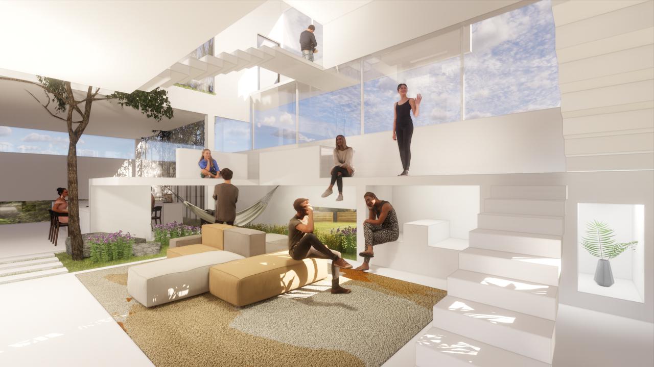 I set the public space in the lower part of the house. Set the private space at the top.This allows for the separation of activities and ensures that people have open spaces where they can interact and also have their own private spaces. =1'0"
