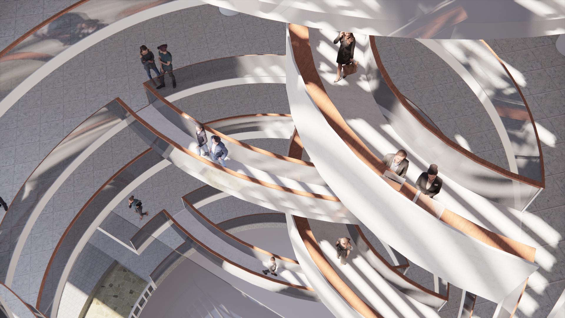 My idea of an advocacy center is a space that connects not only people to people, but also people to nature. By adding different vertical spaces to bring nature and sunlight into the building, it will also increase the connection between different floors. The new building will be a new space that welcomes the people who work here and the neighborhood.