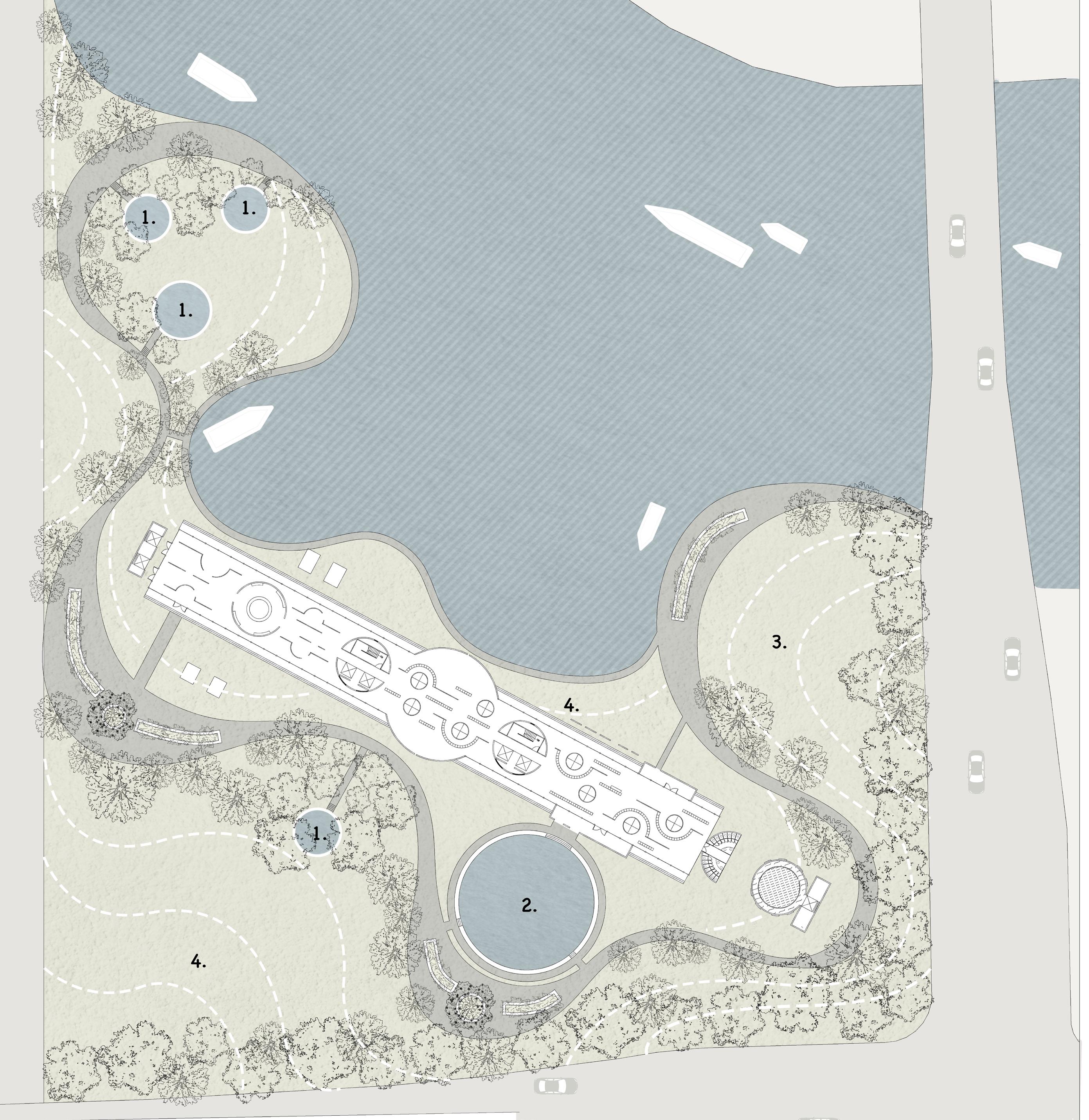 This is an adaptive reuse situation where we will be engaging an existing set of architectural elements, developing a new program situated within and on a particular site located along the Chicago river. The project is located next to the Chicago River and was originally a cement factory, which we need to transform into a bath house. I propose a solution strategy based on the current situation of the site and the site problems. The building itself and the site around the building will be renovated and updated with respect to the original building.