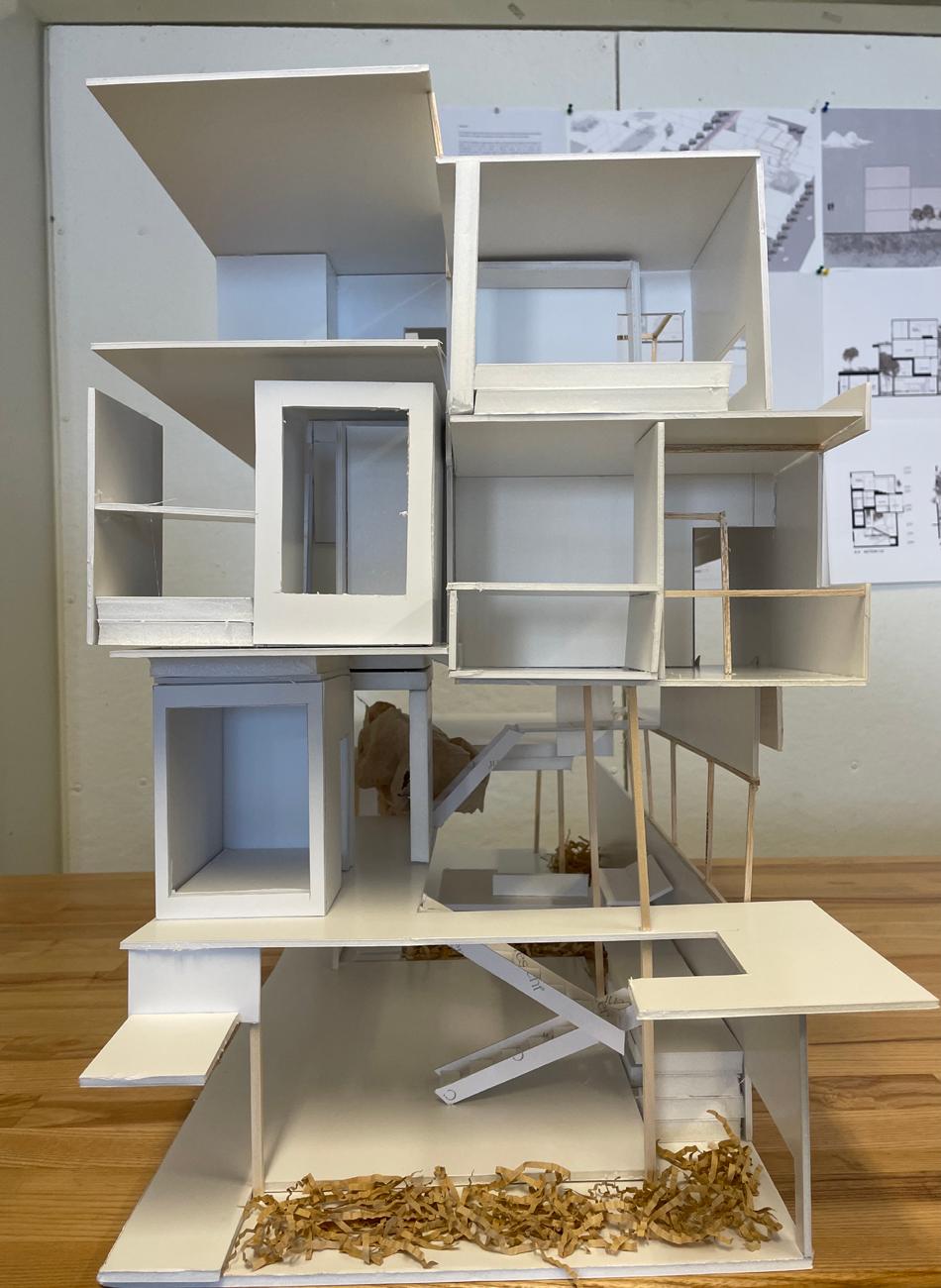 For my house, I continued to use the ideas we had in the block and used them in the interior design.The interior space of the house as a whole is an ‘L’ shape. I wanted to keep people in close contact with nature even indoors, so I set up two vertical plant spaces in the interior. I used stairs to connect the different functional spaces and put them at different heights to enrich the experience of moving around the interior and to ensure that people can see or touch the natural spaces no matter where they are.