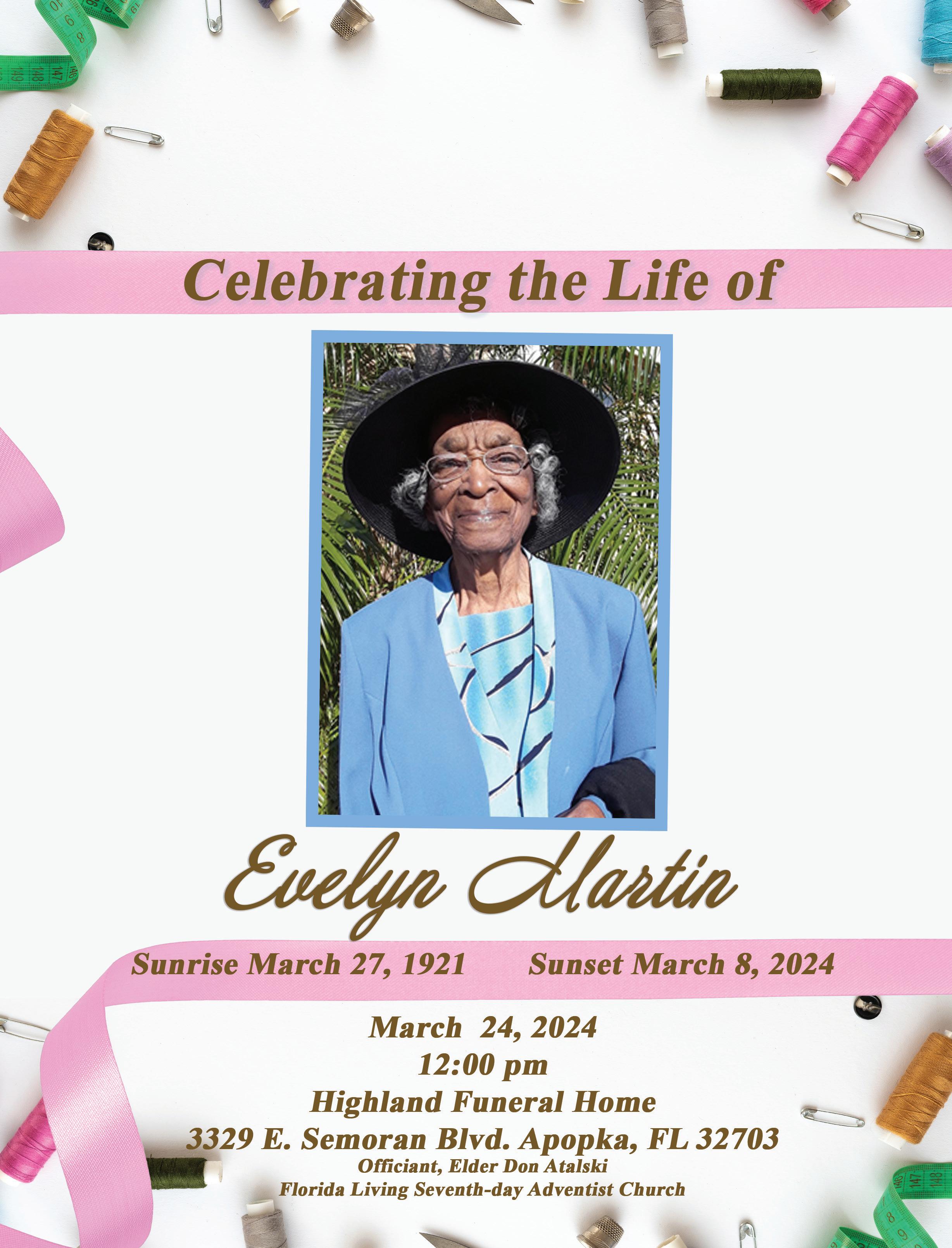 Evelyn Cornwall Martin passed peacefully with family at her side on March 8, 2024, in Miramar, Florida where she found solace in the home of her son Wayne. Evelyn was born on March 27, 1921, on Union Island, an island in the Grenadines archipelago, to Nell Decoto Cornwall and George Cornwall.