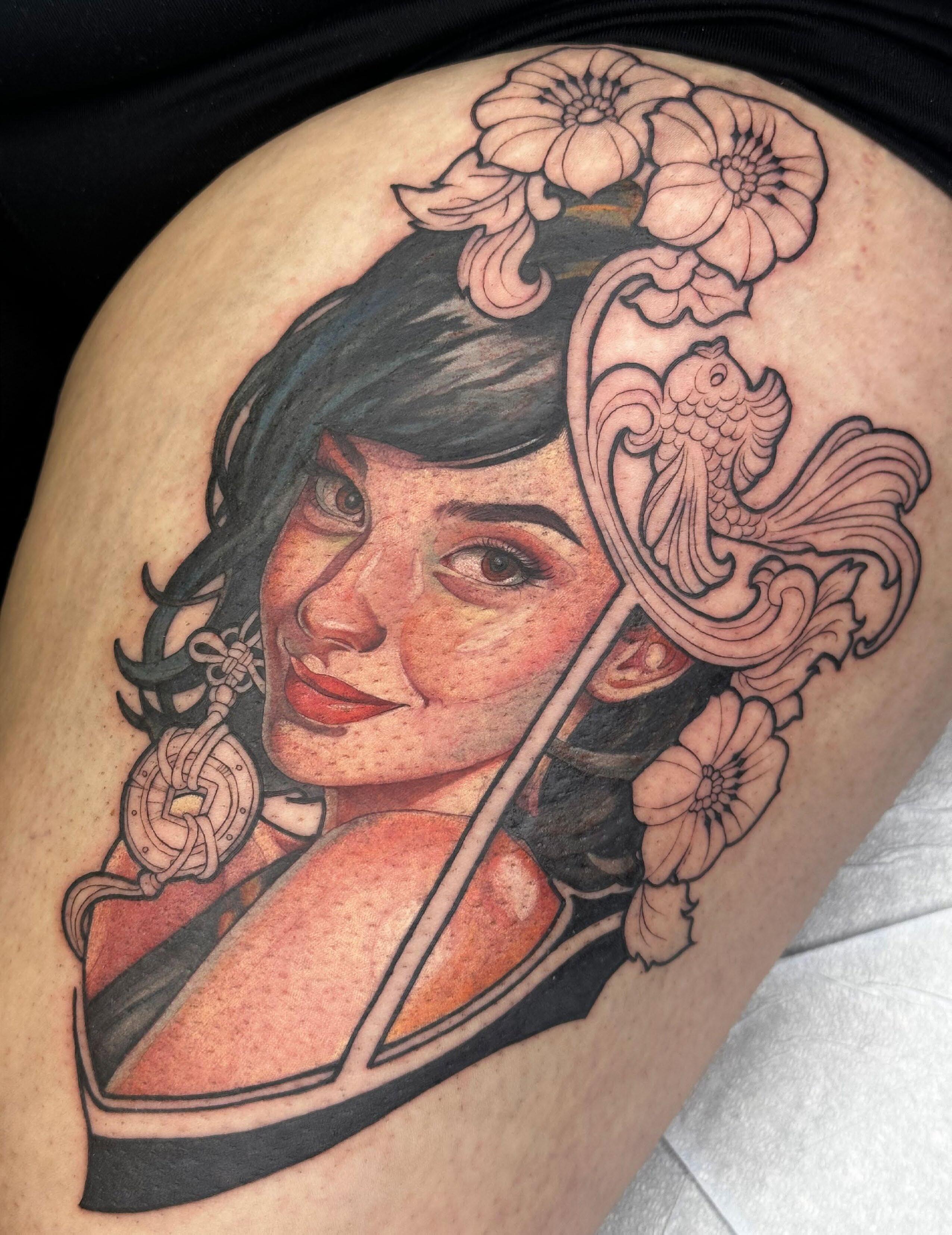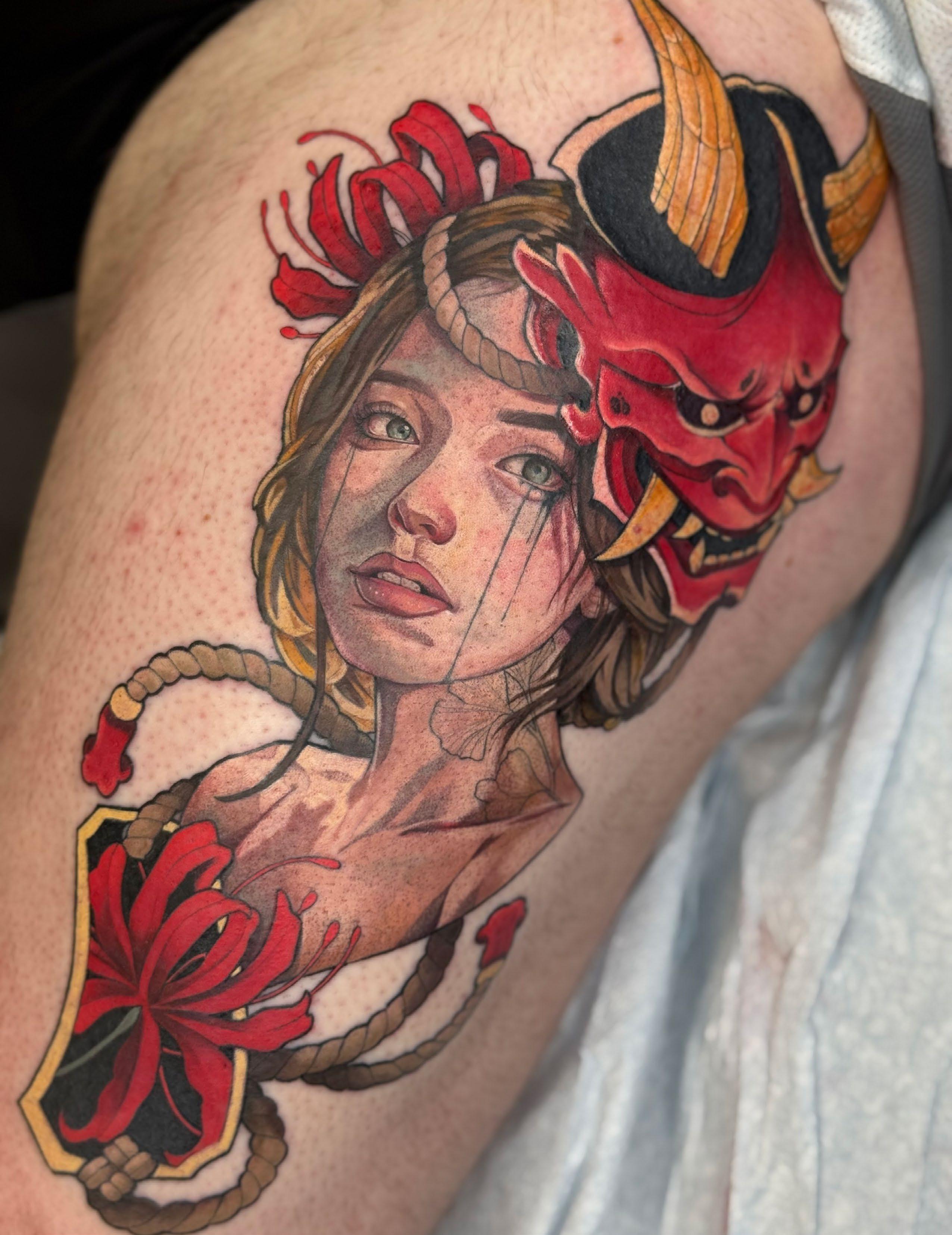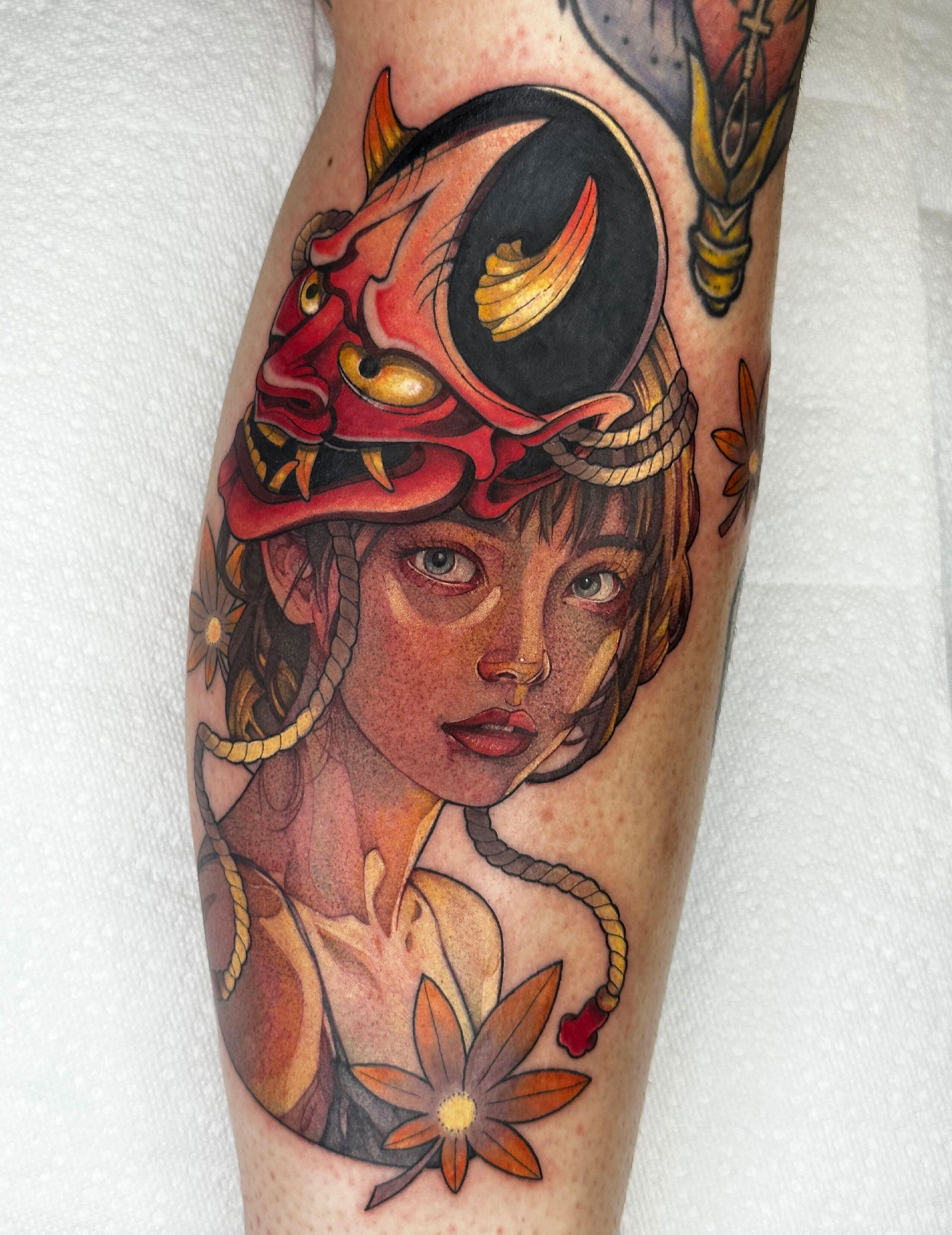I like to say it chose me! When I originally approached which style I’d like to specialize in, I had a love for traditional Japanese, actually. Over time, I fell out of love with the more traditional, to-the-book aspects of Japanese tattooing and started leaning towards Neotraditional Japanese. Being able to create designs with the imagery of typical Japanese subjects without the limitation of the traditional rules is something I enjoy making. I also have a great love for Illustrative Dotwork and black and grey tattooing, and I hope to be able to create more pieces where I can integrate more Neo and Illustrative styles into one piece!