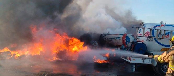 Además, se aprecia como las pipas y la plataforma, estacionadas en el predio, eran consumidas por el fuego; a unos metros se encontraban estacionadas otras unidades.