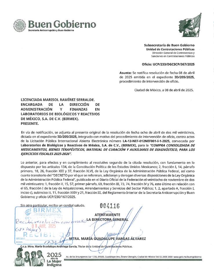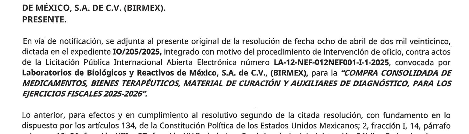 La notificación, emitida el 8 de abril y dirigida a Birmex —organismo encargado del proceso—, frena las megacompras destinadas a abastecer al sistema de salud.