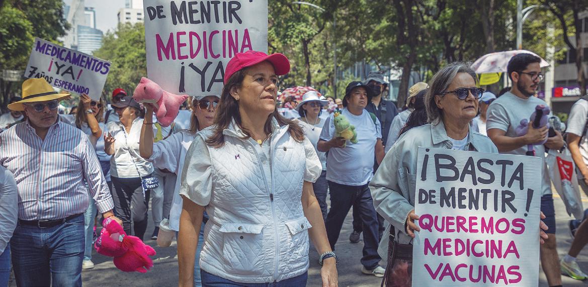 Eran madres, padres, abuelos y voluntarios de organizaciones civiles. Unos caminaban con fotos de pacientes; otros, con playeras impresas con mensajes que exigían atención médica digna, carteles que pedían al Gobierno federal “medicinas ya” o frascos vacíos de medicamento como símbolo del abandono que sienten.