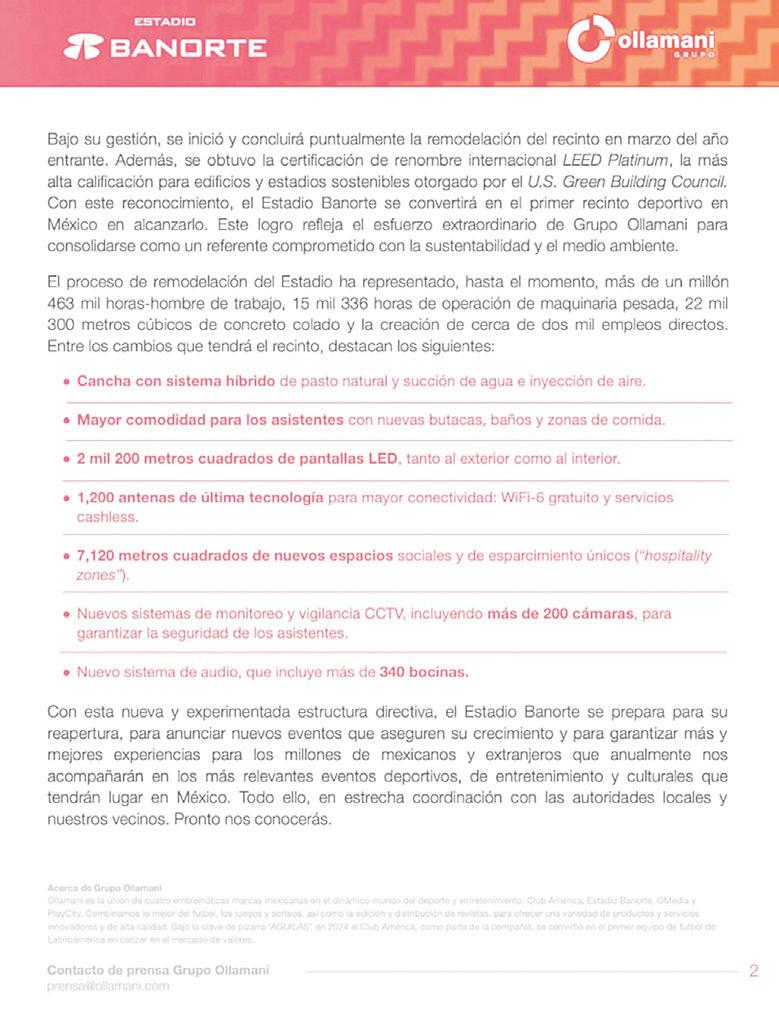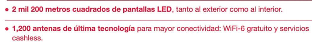 Entre las promesas de la empresa, se indicó la colocación de dos mil 200 metros cuadrados de pantallas led al interior y exterior, más de 200 cámaras nuevas de vigilancia, mil 200 antenas y 340 bocinas. Estás mismas hoy se ven lejanas de estar listas, al menos para la reinauguración del próximo 28 de marzo y el México ante Portugal.