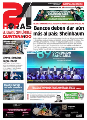 La Presidenta resaltó la necesidad de extender el nivel del crédito en México y destacó que todavía se espera más de la banca nacional. En Quintana Roo, afirmó que necesitamos avanzar en la digitalización, pues es un proceso para incrementar el otorgamiento de líneas crediticias por lo que propuso a los banqueros trabajar de forma conjunta con el Gobierno. Respecto al T-MEC, la mandataria externó que se mantienen positivos, ya que se puede tener una labor coordinada con Estados Unidos NEGOCIOS P. 13