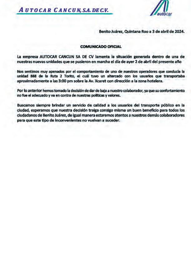 con sede en Quintana Roo, deberá salir como máximo en el mes de junio.