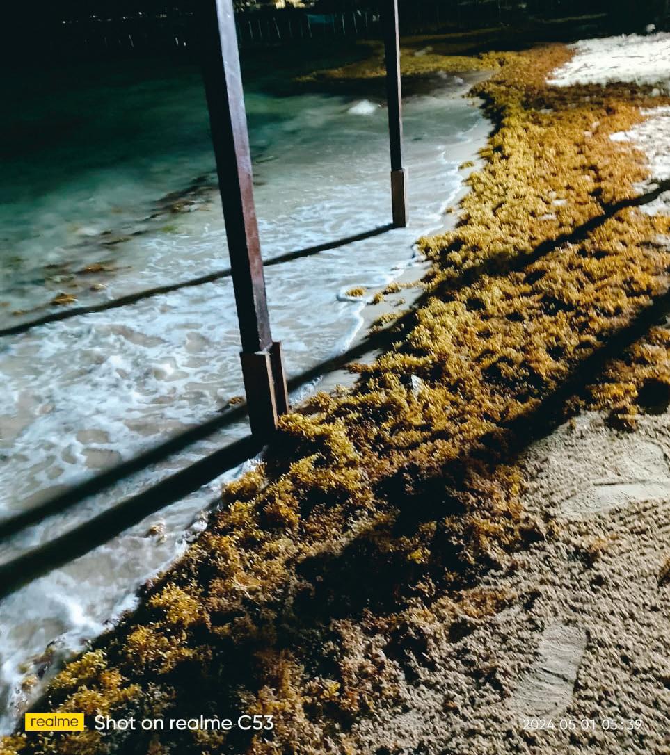 La macroalga se adelantó antes de tiempo a la temporada y tomó por sorpresa a la Marina, encargada de combatir su arribo. Denuncian que apenas se ha colocado el 30 por ciento de las mallas sargaceras, de los mil 450 metros de barrera que debe instalarse en la Costa Maya LOCAL P.6