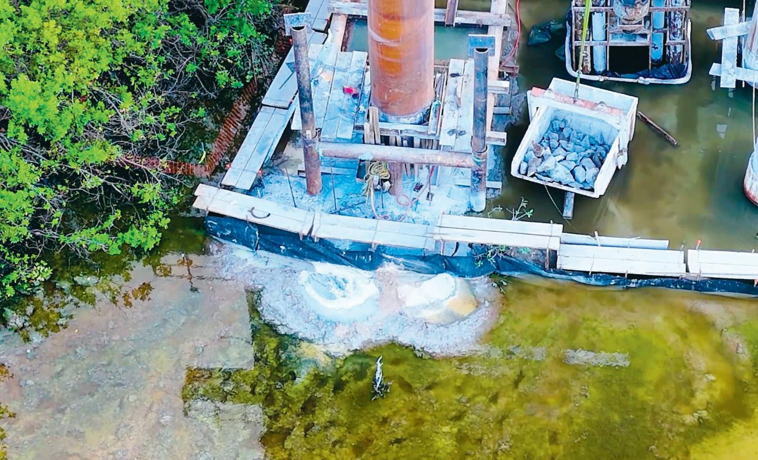 DERRAME. Vista aérea del derrame de cemento en el cuerpo lagunar, junto a una especie protegida de manglar. Activistas critican la obra y la SICT responde que la construcción del puente está supervisada en materia ambiental por tres empresas especializadas