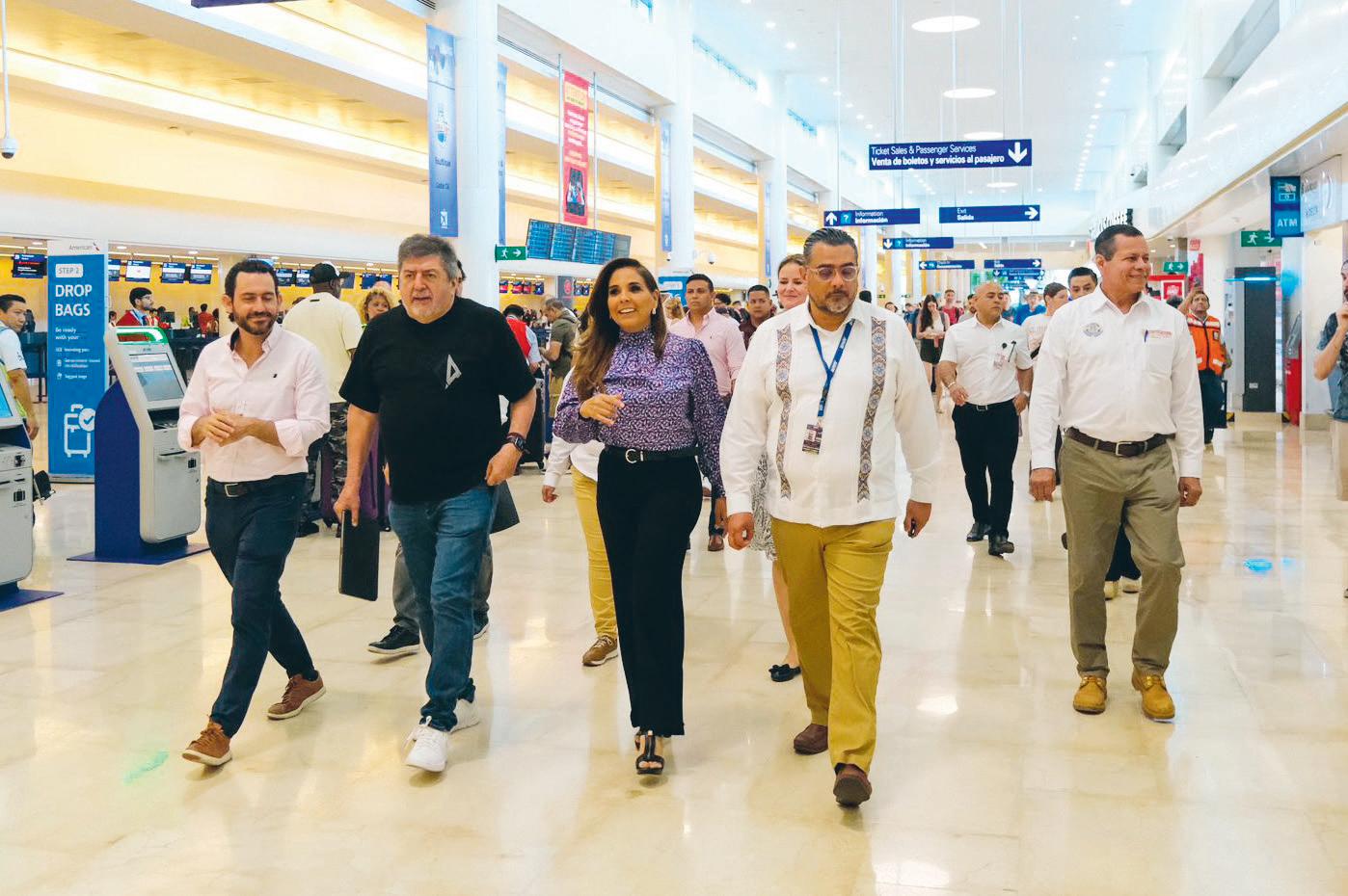 Quintana Roo en el mundo entero en esta Nueva Era del Turismo del Caribe Mexicano”, añadió la gobernadora acompañada del subsecretario de Transporte de la SICT, Rogelio Jiménez Pons y de Miguel Enrique Vallín Osuna, titular de la AFAC. El AIC registró el año pasado 32.7 millones de pasajeros, alrededor de 2.7 millones por mes y entre 40 a 60 mil por día; moviliza alrededor de 60 mil maletas con 51 aerolíneas conectadas con 120 ciudades del mundo, lo que genera una ocupación promedio del 72.3 por ciento en los destinos. Estos números confirman la importancia del aeropuerto de Cancún. Se precisó que fue una visita no programada, es decir, de sorpresa, para constatar justamente su operación real, lo que permitirá tomar las decisiones adecuadas. Posteriormente se realizó la segunda sesión del Consejo Hotelero del Caribe Mexicano, en la que se revisaron temas de migración, movilidad, seguridad, muelles y cruceros e infraestructura./ 24 HORAS