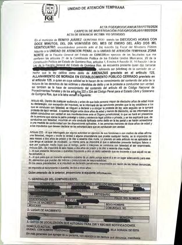 Q. ROO REDACCIÓN Tel. 1454-4001 / 1454-4014; redaccion@24-horas.mx PUBLICIDAD Tel 1454-4013; publicidad@24-horas.mx. CIRCULACIÓN Tel 1454-4001, ext. 134; javier.lopez@24-horas.mx 24 HORAS EL DIARIO SIN LÍMITES QUINTANA ROO. Periódico diario. Editor Responsable: Alberto González Martínez. Certificado de Reserva de Derechos al Uso Exclusivo otorgado por el Instituto Nacional del Derecho de Autor: 04-2018-091909321800-101. Certificado de Licitud de Título y Contenido 17225 otorgado por la Comisión Calificadora de Publicaciones y Revistas Ilustradas. Domicilio de la Publicación: Av. Bonampak Mza. 2, SM 9, Lote 5, Local 2 Bis, C.P. 77500, Cancún, Quintana Roo. Teléfono 998 629 5548. Impreso en la Ciudad de Cancún por: Grupo Informático Cancún Caribe, S.A. de C.V., Av. Francisco I. Madero Mza. 5 Lote 8, SM. 70, C.P. 77510, Cancún, Quintana Roo. Distribuido por: Grupo Informático Cancún Caribe, S.A. de C.V. https: //24horasqroo.mx/ / youtube: @24horasqroo / Facebook: 24HorasQuintanaRoo DIRECTOR GENERAL CÉSAR MUÑOZ PADILLA EDITORES BRISA R. MUÑOZ RICARDO TORRES DISEÑO GRÁFICO HUGO LAZOS