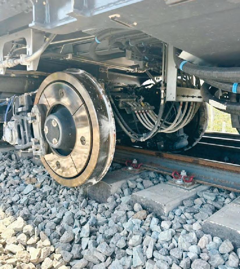 Los rieles son de acero calibre 115 lb/yd para guiado del tren; los durmientes (de concreto para soportar los rieles) y balasto de basalto, una piedra natural de origen volcánico que reparte la carga de la vía.
