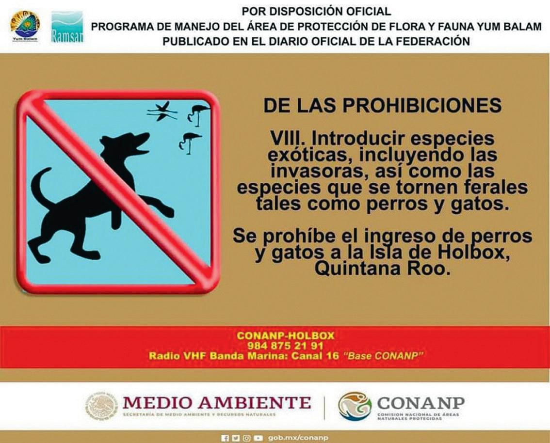 Quedó legalmente prohibida la introducción de perros y gatos a la isla de Holbox, de acuerdo con el Programa de Manejo del Área de Protección de Flora y Fauna Yum Balam. A partir del jueves 23 de mayo está prohibido introducir especies exóticas, incluyendo las invasoras, así como las ferales -animales domésticos que escapan del control humano o sobreviven al abandono- como perros y gatos a la ínsula del municipio de Lázaro Cárdenas./ QUADRATÍN