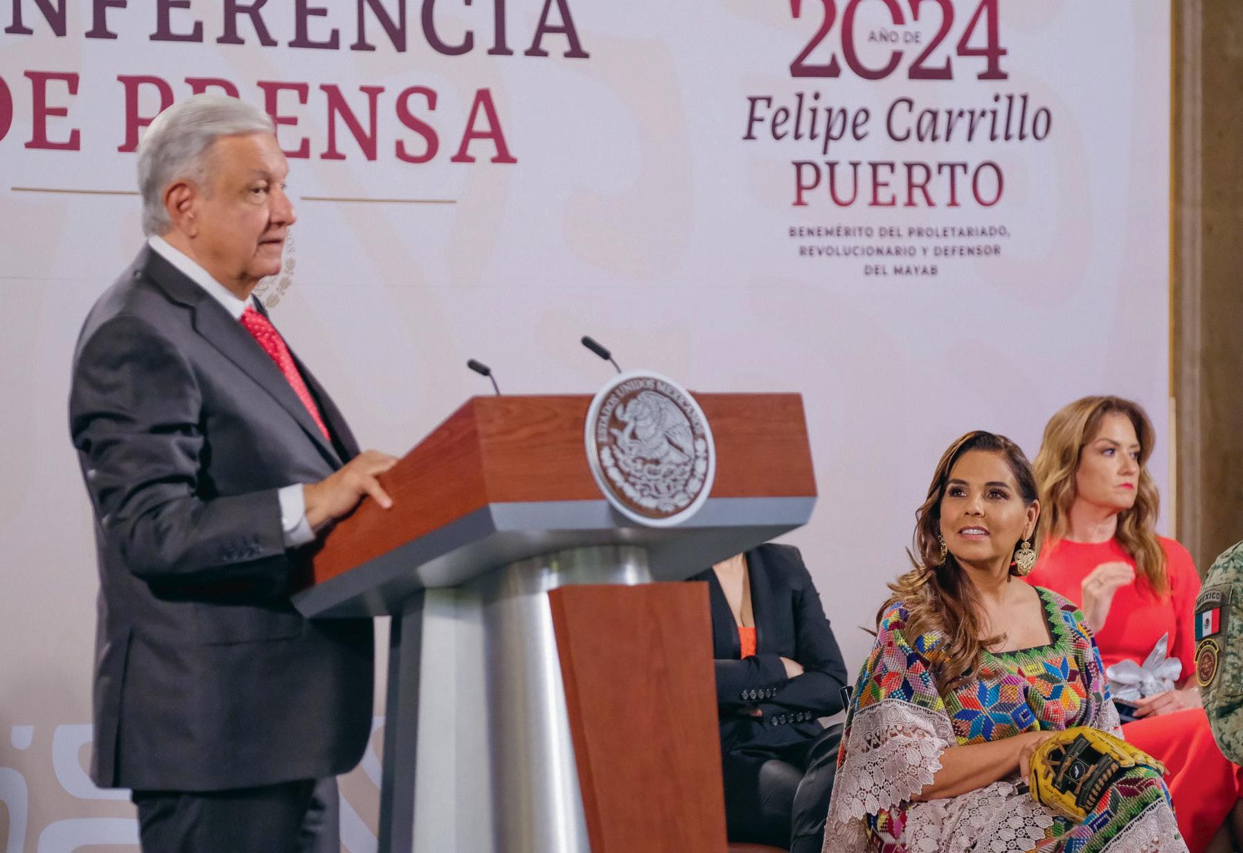 En la conferencia de prensa matutina del presidente Andrés Manuel López Obrador, la gobernadora de Quintana Roo, Mara Lezama Espinosa, explicó la trascendencia que el Tren Maya tiene para la entidad y para el sureste del país, así como las acciones de justicia social vinculadas con esta obra histórica. La mandataria quintanarroense agradeció al presidente López Obrador el apoyo brindado a los quintanarroenses con una inversión de alrededor de 200 mil millones de pesos. En esta conferencia, la gobernadora estatal se refirió al tramo 4 del Tren Maya, que va desde Izamal, Yucatán, a Cancún, Quintana Roo, con 239 kilómetros de vía doble electrificada, pasando por Chichén Itzá y Valladolid. También habló de las obras de fortalecimiento de la infraestructura de Cancún, como la reconstrucción completa del bulevar Colosio, con el cableado subterráneo que lleva un 60 por ciento de avance; el distribuidor vial del aeropuerto, la avenida Chac Mool y el Puente Nichupté.