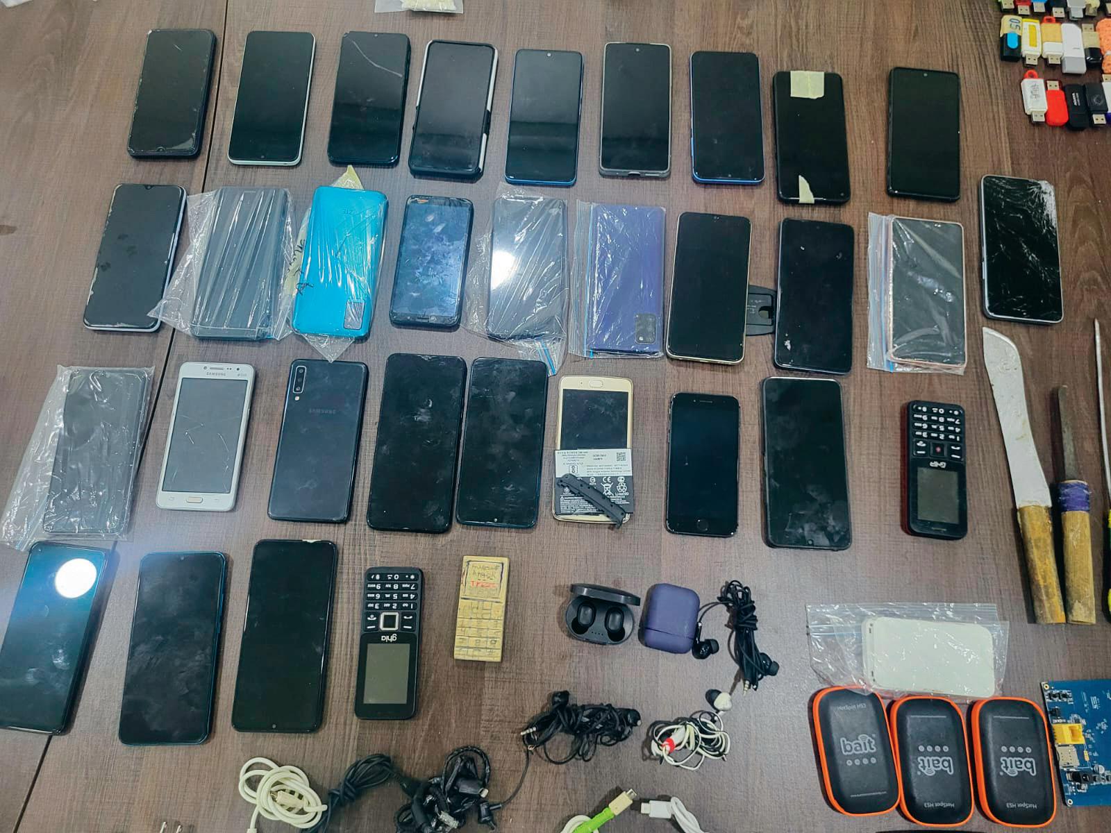 Entre los objetos confiscados durante la inspección se encontraron 32 teléfonos móviles, 37