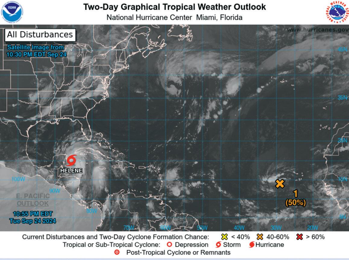 Los reportes de la Comisión Nacional del Agua (Conagua) hasta las 21:00 horas del martes pronostican que Helene se convierta en huracán en las primeras hordas de este miércoles y se desplace cerca de las costas de Quintana Roo a 55 kilómetros de Cabo Catoche y 68 kilómetros de Cancún alrededor del mediodía, con un área de afectación de 280 kilómetros y del 24 al 28 de septiembre ocasionará precipitaciones, con una estimación de acumulación de agua de entre 200 y 280 milímetros.