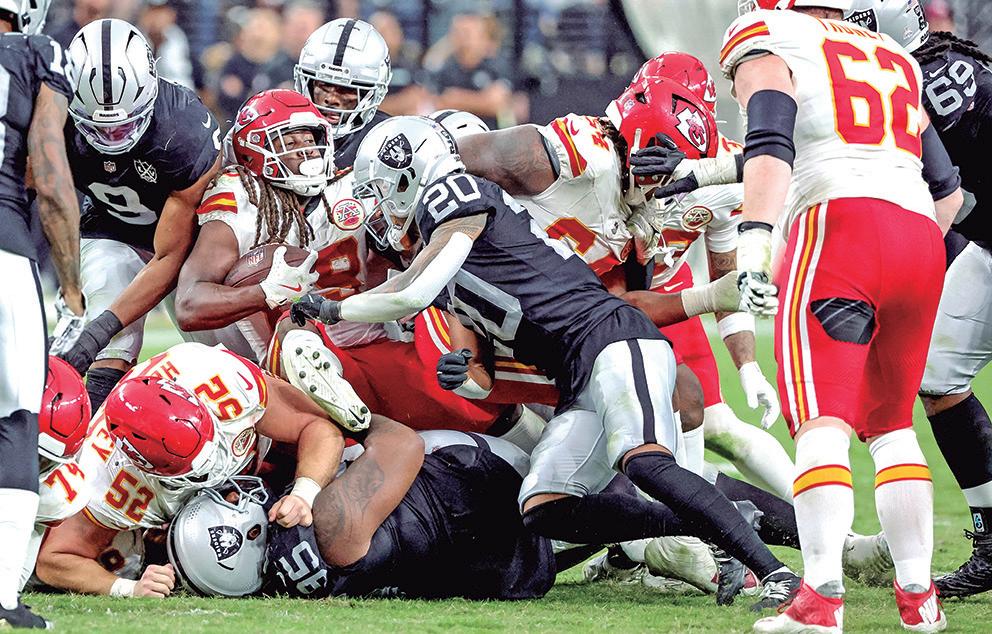 Aún sin dominar a su rival en turno, pero con la efectividad suficiente en ataque y con una defensiva solvente, los Jefes de Kansas City superaron 20-27 a los Raiders de Las Vegas, para sumar así su séptima victoria en el calendario regular. Fueron 252 yardas por aire en total y dos pases de anotación para Patrick Mahomes los aspectos más relevantes para el triunfo del equipo visitante, que con dicho resultado se mantiene como el mejor de toda la National Football League luego de ocho jornadas y único líder en la AFC con registro de 7-0. Con un ofensiva más balanceada, en la que incluyeron 82 progresiones por la vía terrestre, los