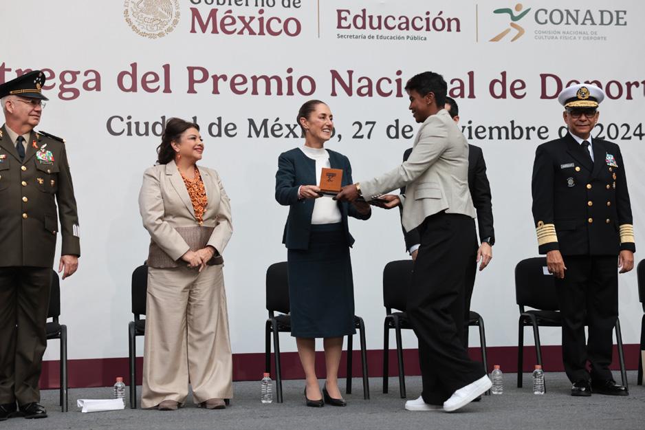 Durante la entrega del Premio Nacional de Deportes 2024 y primera edición bajo su gestión, la Presidenta Claudia Sheinbaum fue reconocida e invitada por los atletas de alto rendimiento del país como capitana del deporte rumbo a la cita olímpica de Los Ángeles 2028.