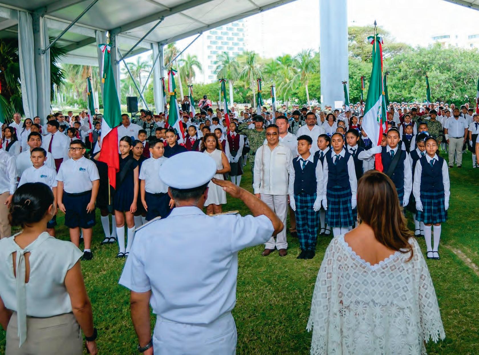 La ceremonia, realizada en el asta monumental de la zona hotelera de Cancún, contó con la presencia de au-