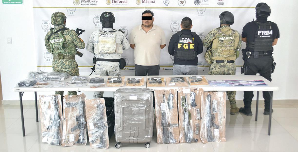 Durante una inspección voluntaria al detenido y al vehículo Chevrolet Captiva en el que viajaba, los agentes aseguraron un arsenal integrado por 11 armas de fuego de uso exclusivo del Ejército, Armada y Fuerza Aérea: seis armas largas —dos calibre 7.62 x 39 mm y cuatro calibre .223— y cinco armas cortas tipo pistola, todas con sus cargadores abastecidos.